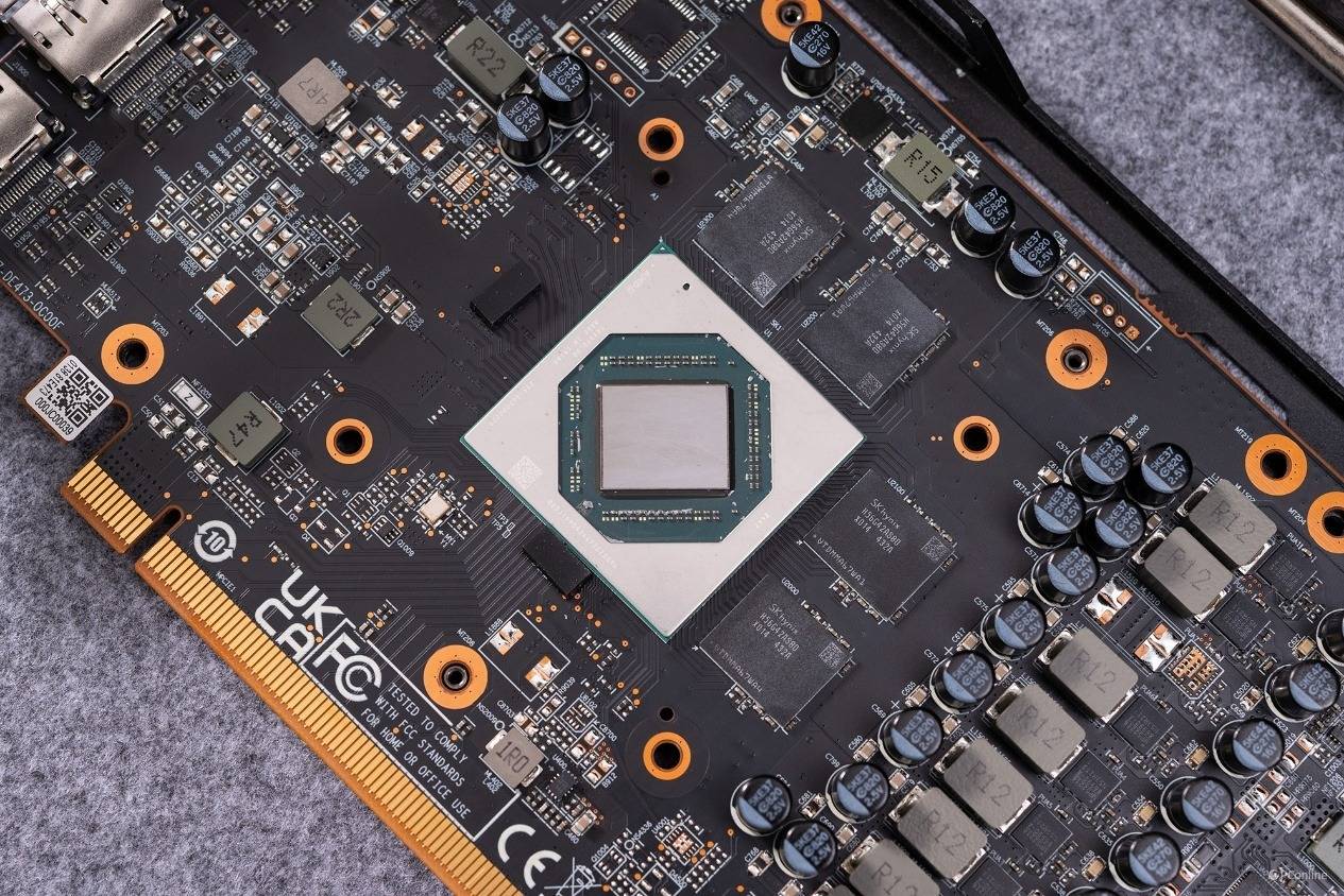 PCB的中央是显卡的“大脑”——Navi 33核心,与此前的RX 7600基本是同款。由台积电6nm工艺打造,一共配置了32个CU单元,共2048个流处理器,除此之外,还搭载32个专用的光追核心和64个AI核心。
