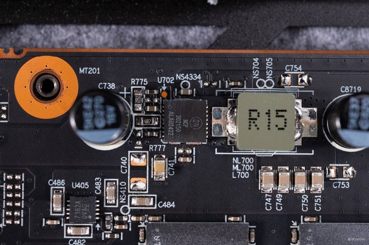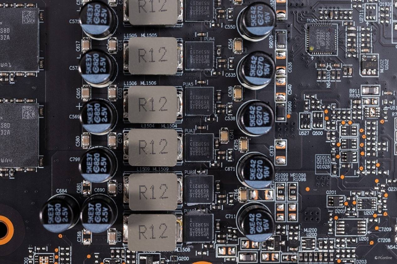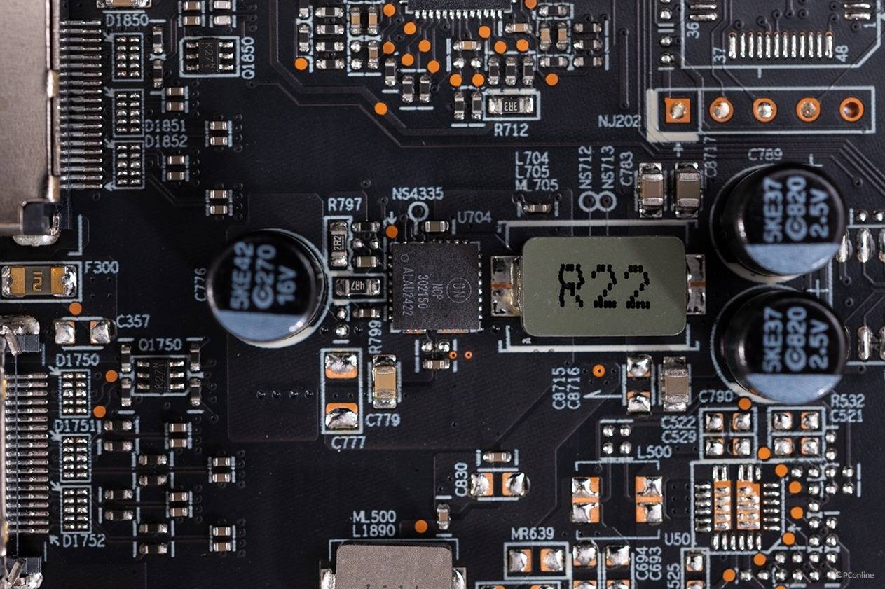 显存供电DrMos芯片则是NCP的302150,平均电流可达50A。