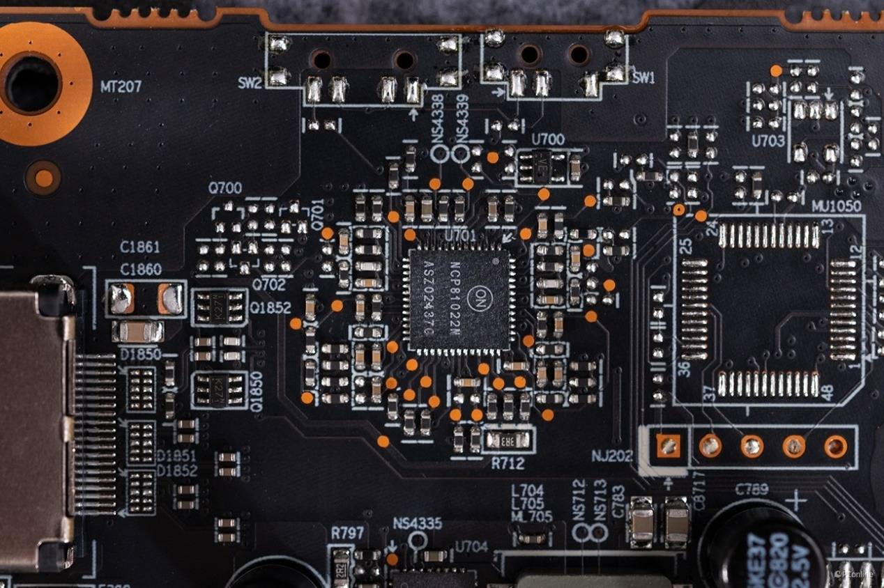 供电PWM控制芯片,采用了来自 MPS(Monolithic Power Systems 芯源)的MP2855和安美森的NCP81022N,两个芯片协同控制核心和显存的供电输出。