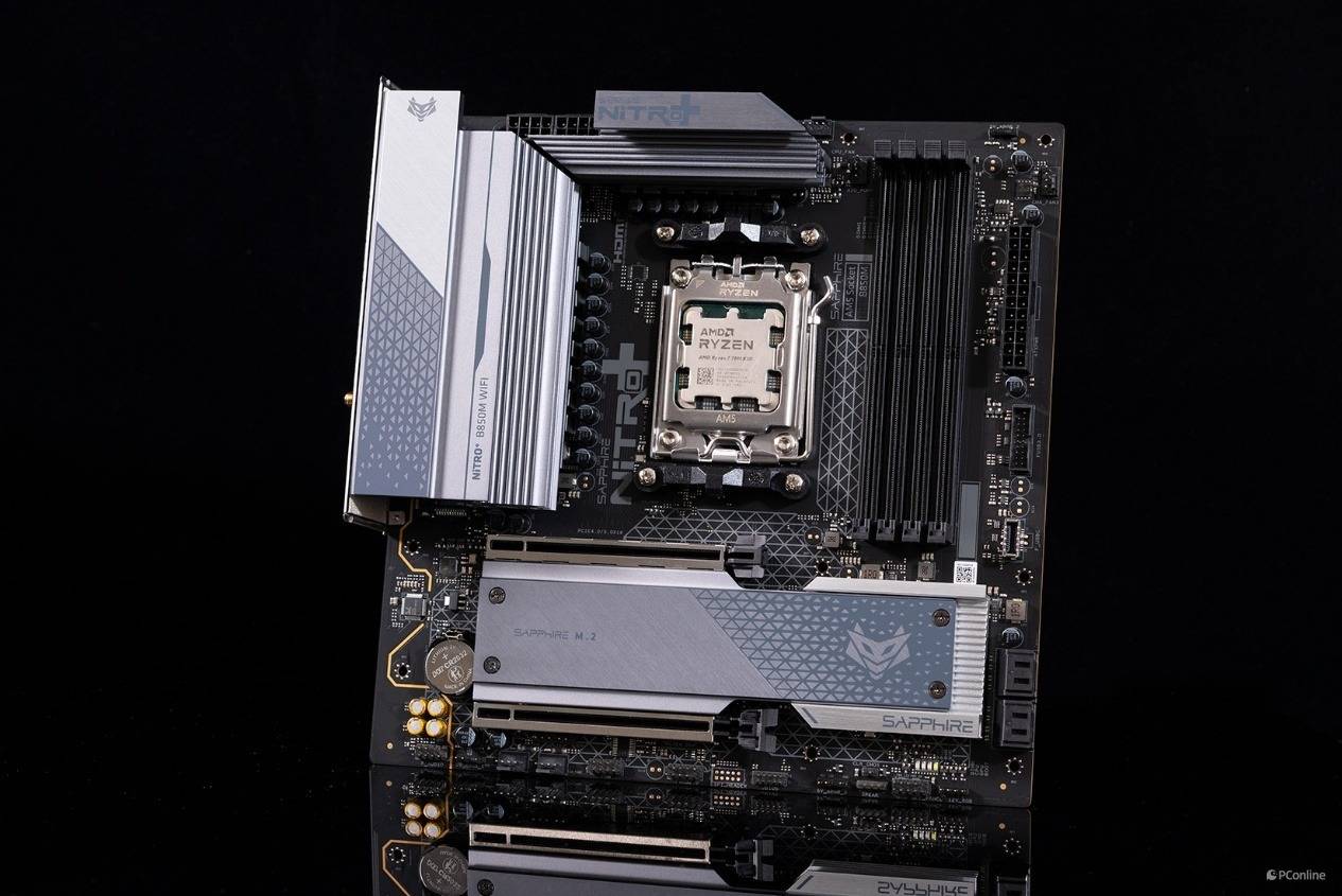 主板方面,我们选择的则是同款蓝宝石Sapphire NiTRO+ 氮动 B850M WIFI,245mm×245mm标准MATX尺寸,外观融合了散热马甲上的独特三角图案,部分区域还有NiTRO+、SAPPHIRE等LOGO标注,银色加以偏灰偏蓝的主题色,整块主板由内而外透露着一种低调而又充满科技的感觉,整机搭配与我们此次上手的白金显卡很搭。