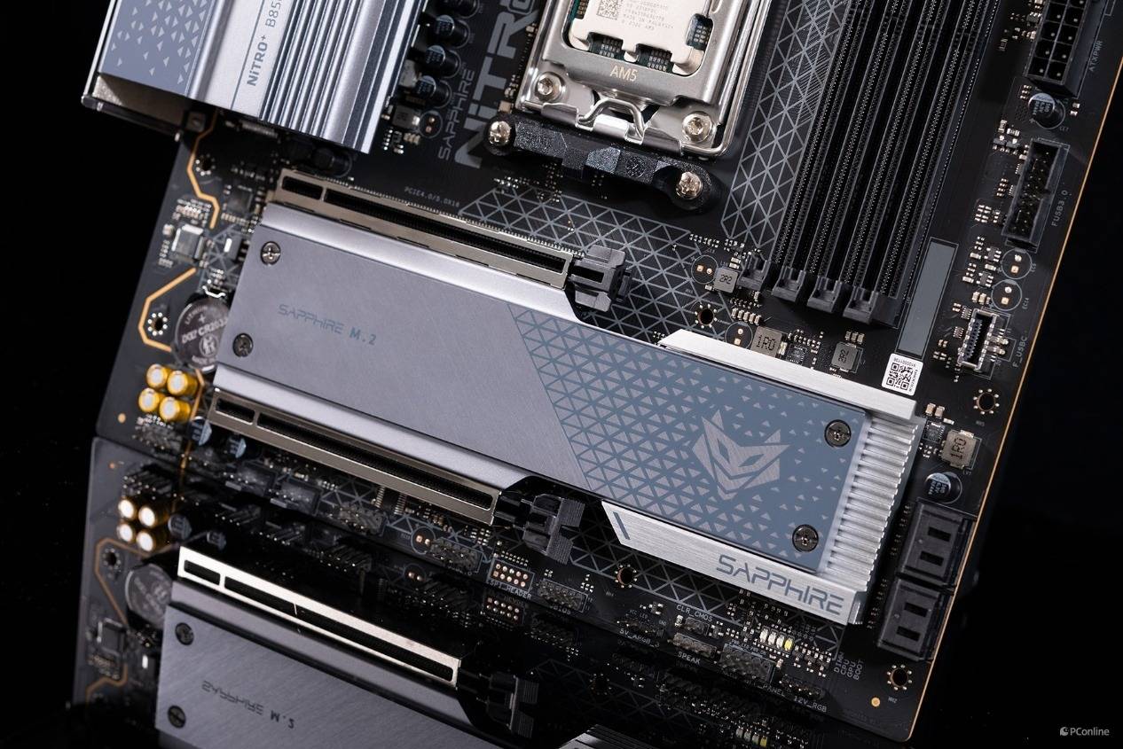 扩展接口也是应有尽有,其中PCIe插槽分别为PCIe 5.0×16以及PCIe 4.0×4,同时主板设有两个M.2插槽,速率也分别是PCIe 5.0及PCIe 4.0,并使用一体式散热片覆盖,进一步提高散热效能和稳定性。