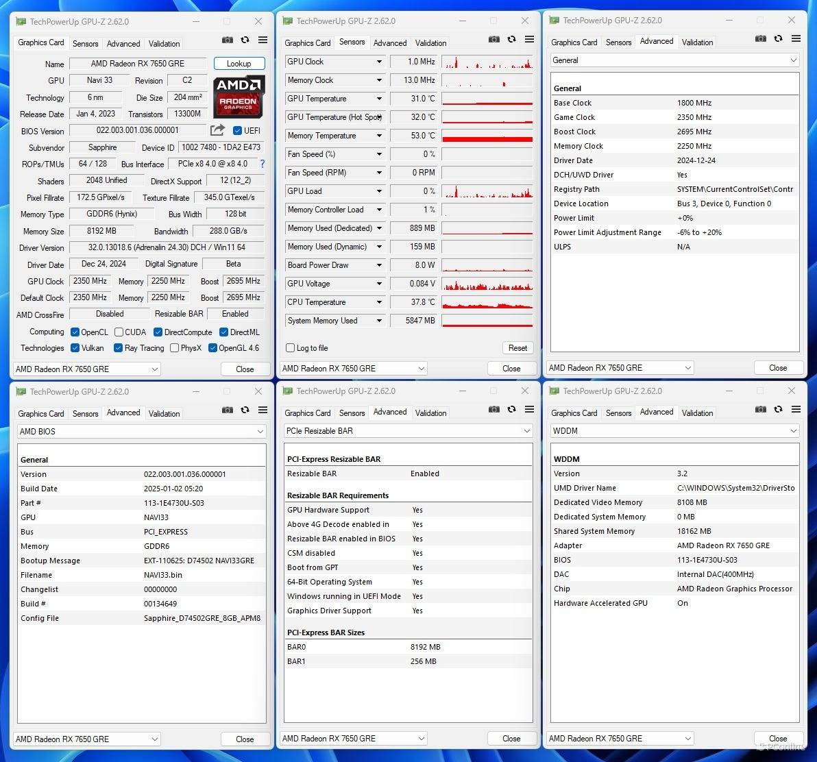 上机测试前还是按照惯例,在GPU-Z中看看这款显卡的信息。在GPU-Z中可以看到这款显卡采用的是Navi 33核心,显卡基准频率为2350MHz,Boost频率可以达到2695MHz。除此之外,在GPU-Z中还可以看到此时主板的Resizable BAR功能已开启,显卡能够最大限度的发挥出其全部性能。