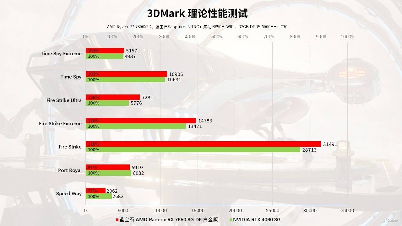 接下来就该正式开始测试了,首先进行的是3DMark的理论性能测试。从测试成绩就可以看出蓝宝石AMD Radeon RX 7650 GRE 8G D6白金版的性能释放还不错。在DX12 Time Spy测试中,这张显卡领先RTX 4060约3%以上,如果换到DX11的Fire Strike测试,它的成绩更加离谱,最高可以领先RTX 4060约24%以上,即便是之前一直被人诟病的光追项目Port Royal,现在其与RTX 4060也是五五开的局面。