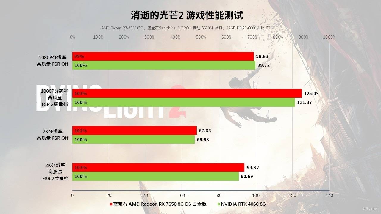 在《消逝的光芒2》中,蓝宝石AMD Radeon RX 7650 GRE 8G D6白金版开启FSR 2质量档可以实现1080P 125 FPS的表现,2K分辨率下也能稳稳的运行在94 FPS以上。两项成绩均比RTX 4060强约3%以上。