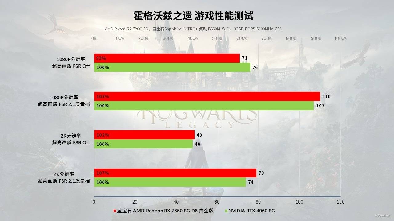 在《霍格沃兹之遗》中,蓝宝石AMD Radeon RX 7650 GRE 8G D6白金版在原生1080P以及2K分辨率下,帧数分别是71 FPS和49 FPS,稍稍落后于RTX 4060,不过两款显卡同时开启FSR 2质量档后,蓝宝石AMD Radeon RX 7650 GRE 8G D6白金版实现了反超,性能领先最大可以去到7%。