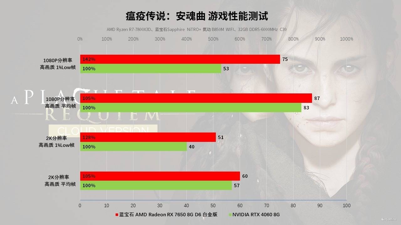 3A大作《瘟疫传说:安魂曲》的表现也比较类似,同样的画质设置,蓝宝石AMD Radeon RX 7650 GRE 8G D6白金版就是能够领先RTX 4060,并且仔细看下图可以发现,领先的不只是平均帧,1%Low帧才是两张显卡差距最明显的。蓝宝石AMD Radeon RX 7650 GRE 8G D6白金版的1%Low帧都比RTX 4060要高30%左右,实际游戏中掉帧现象更少,更稳定。
