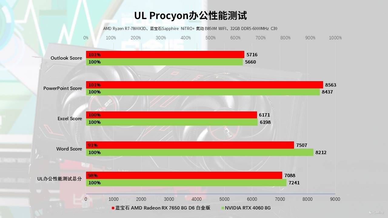看完了游戏性能测试,接下来看点硬核的,创作生产力也是大多数用户所关注的重点。首先我们用UL Procyon对这款显卡进行一个基础测试,办公生产力大家的表现不相上下,互有胜负。