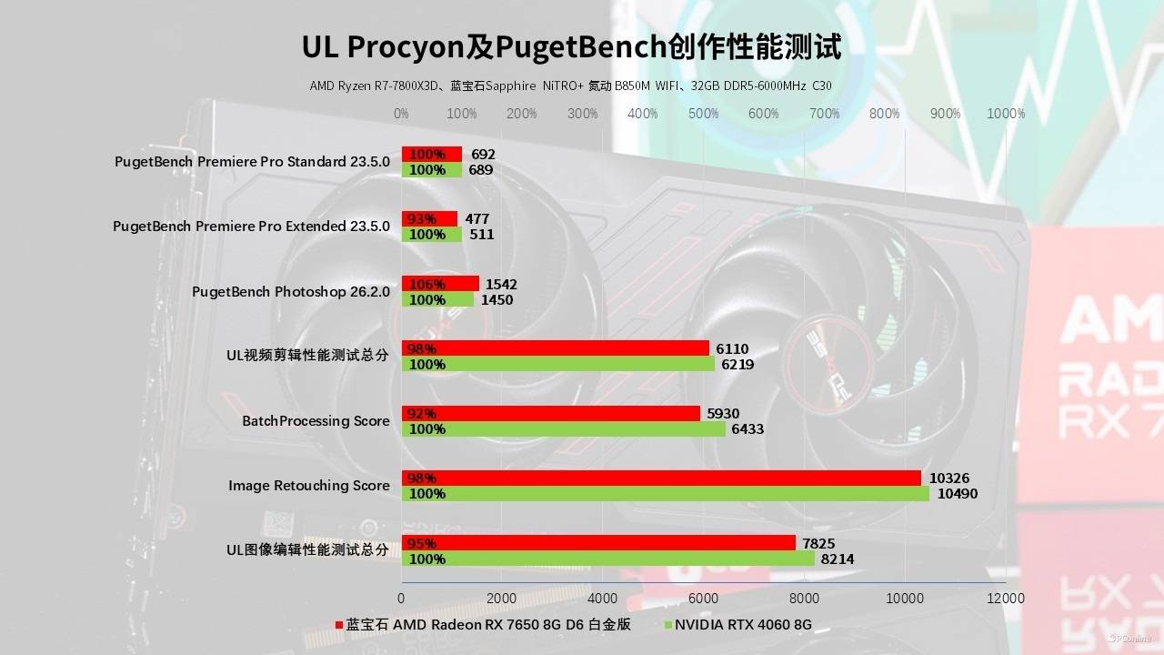 而在图像编辑以及视频剪辑部分,两款显卡的表现也在伯仲之间,不过也有部分项目非常亮眼。例如PugetBench的Photoshop测试里,蓝宝石AMD Radeon RX 7650 GRE 8G D6白金版得分1542,相比RTX 4060领先了6%以上。