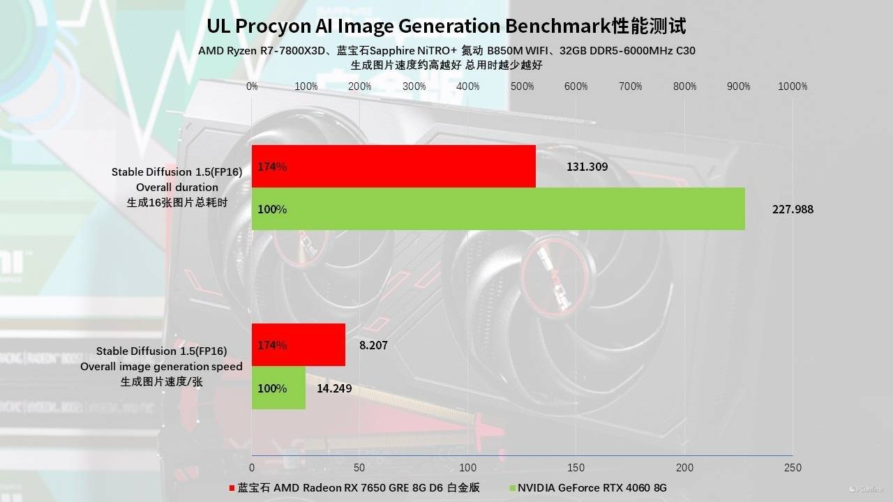 不过,可能是由于驱动方面的原因,一些AI应用的表现目前还不及预期。应该是驱动还没优化好所致,后续待AMD优化完成,蓝宝石AMD Radeon RX 7650 GRE 8G D6白金版也能带来出色的AI体验。