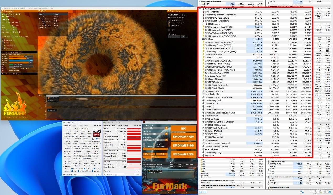 最后是功耗与温度测试,在室温20°的环境下,Furmark甜甜圈设定为1920 x 1080分辨率。在烤机10分钟后,蓝宝石AMD Radeon RX 7650 GRE 8G D6白金版的核心频率能够稳定在1933MHz,满载功耗169W,就拿这个表现,日常使用简直就是轻轻松松!