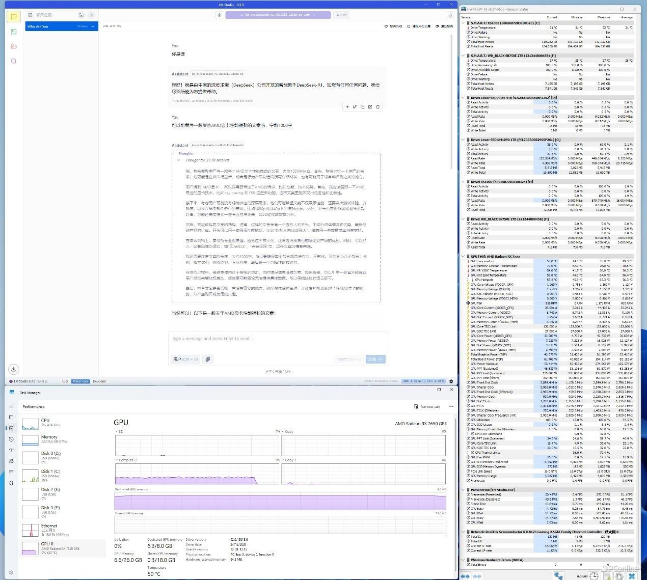 另外,最近很火的DeepSeek本地部署我们也进行了测试,实测蓝宝石AMD Radeon RX 7650 GRE 8G D6白金版可以流畅运行DeepSeek-R1-8B的模型,实测对答、生成答案都非常流畅,速度能够做到15.24Token/s。