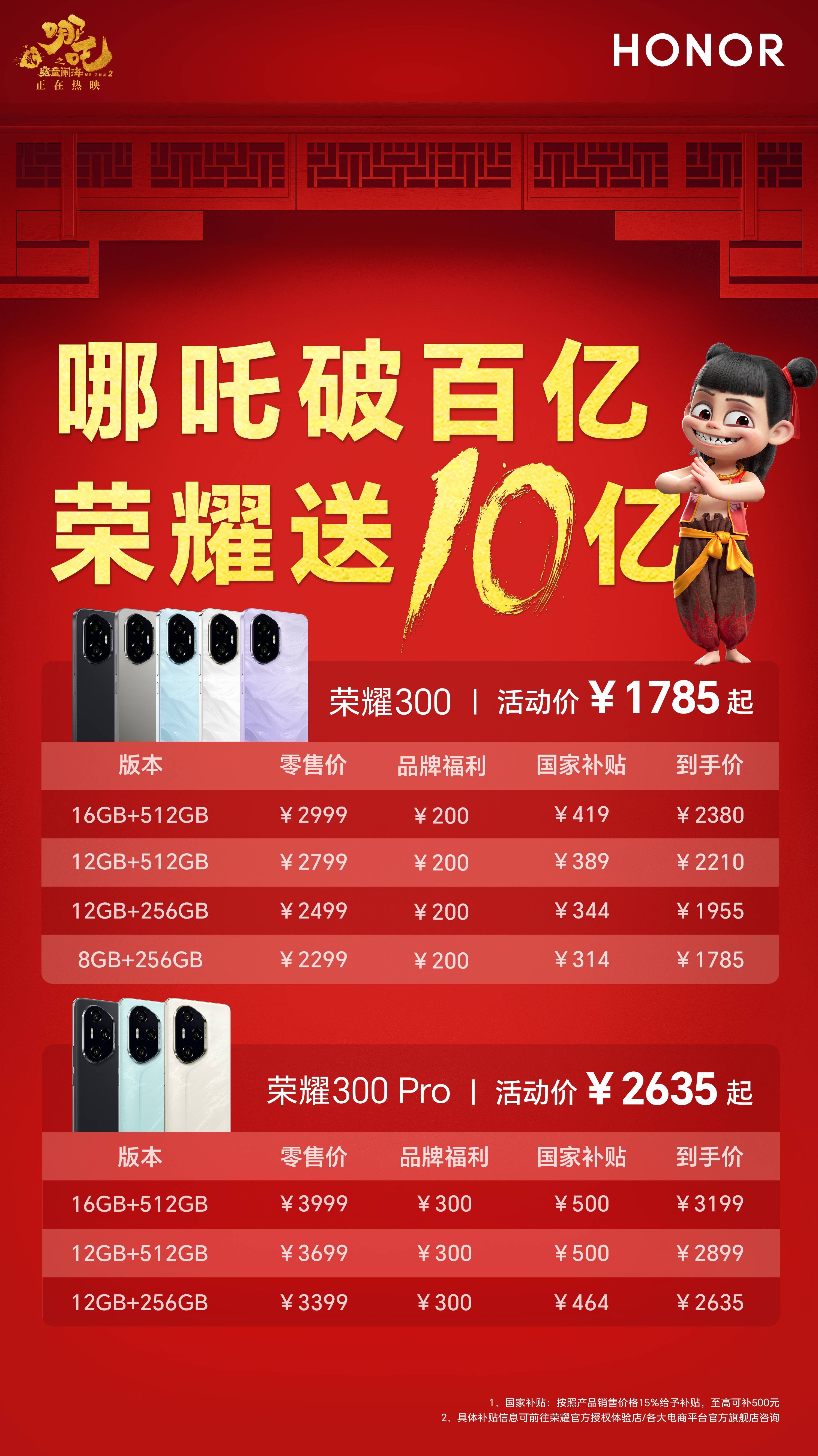 — 与《哪吒2》共庆百亿票房,荣耀300系列国补+厂补叠加,至高优惠800元 —