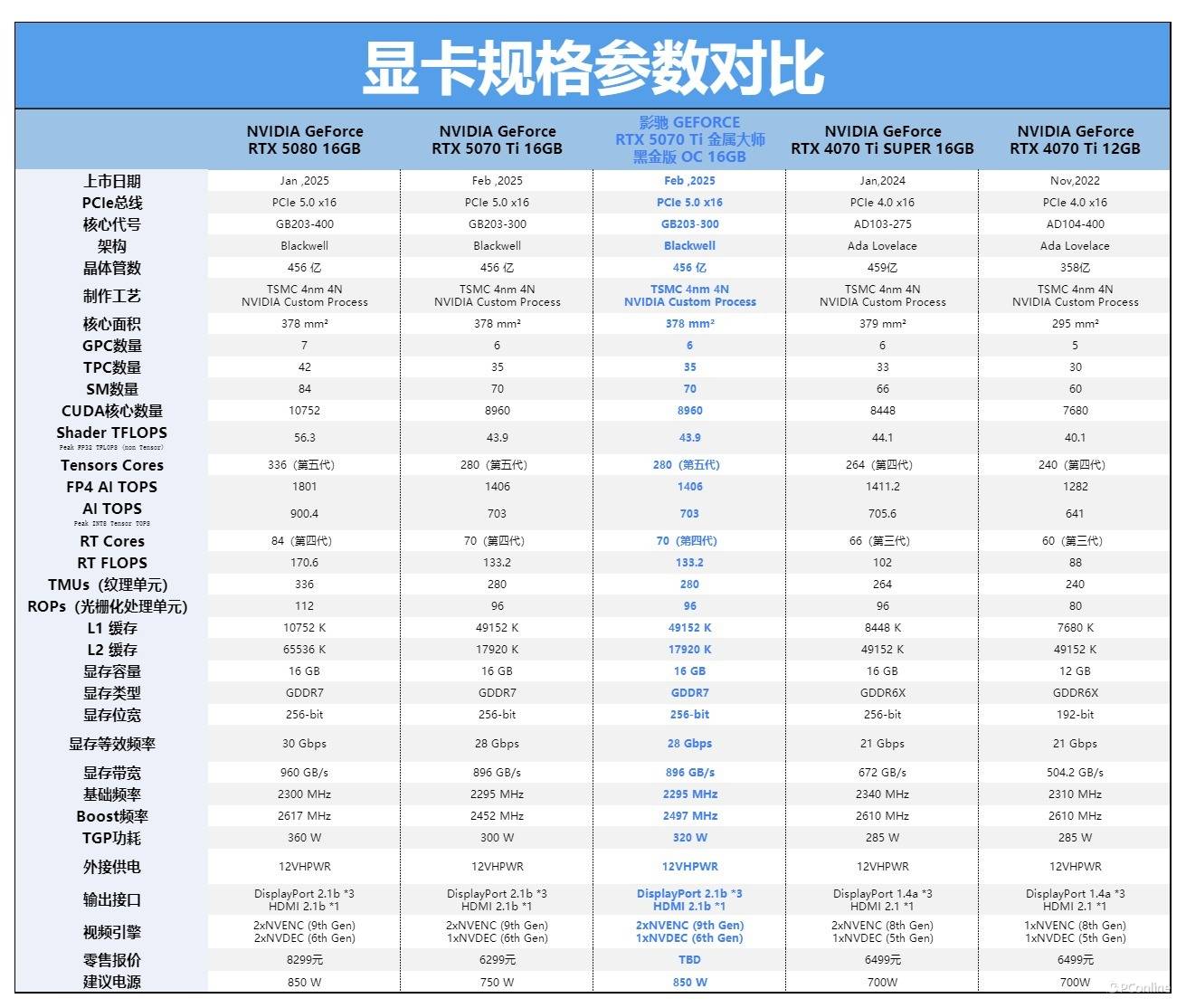 从规格参数来看,GEFORCE RTX 5070 Ti配备了6个GPC、35个TPC、70个SM单元、280个TMUs纹理单元、96个ROPs光栅化处理单元,以及8960个CUDA核心。与上一代的GEFORCE RTX 4070 Ti相比,GEFORCE RTX 5070 Ti在性能规格上更胜一筹,其大部分参数甚至超过了GEFORCE RTX 4070 Ti SUPER显卡。