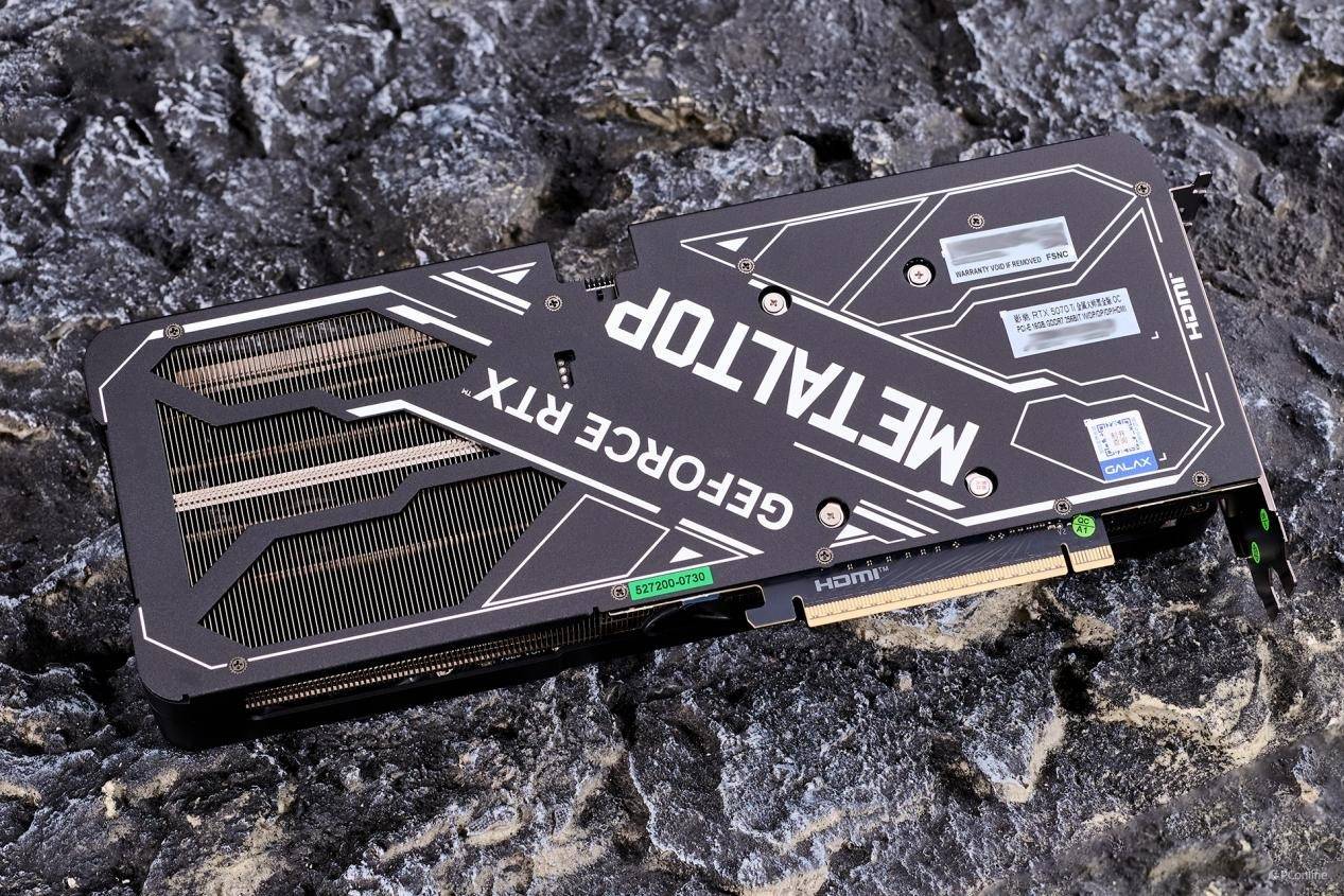 影驰RTX 5070 Ti 金属大师OC 16GB显卡的背面配备了全金属加固背板,这不仅有效保护了显卡背面的电子元件,防止PCB板弯曲变形,还能够辅助散热。