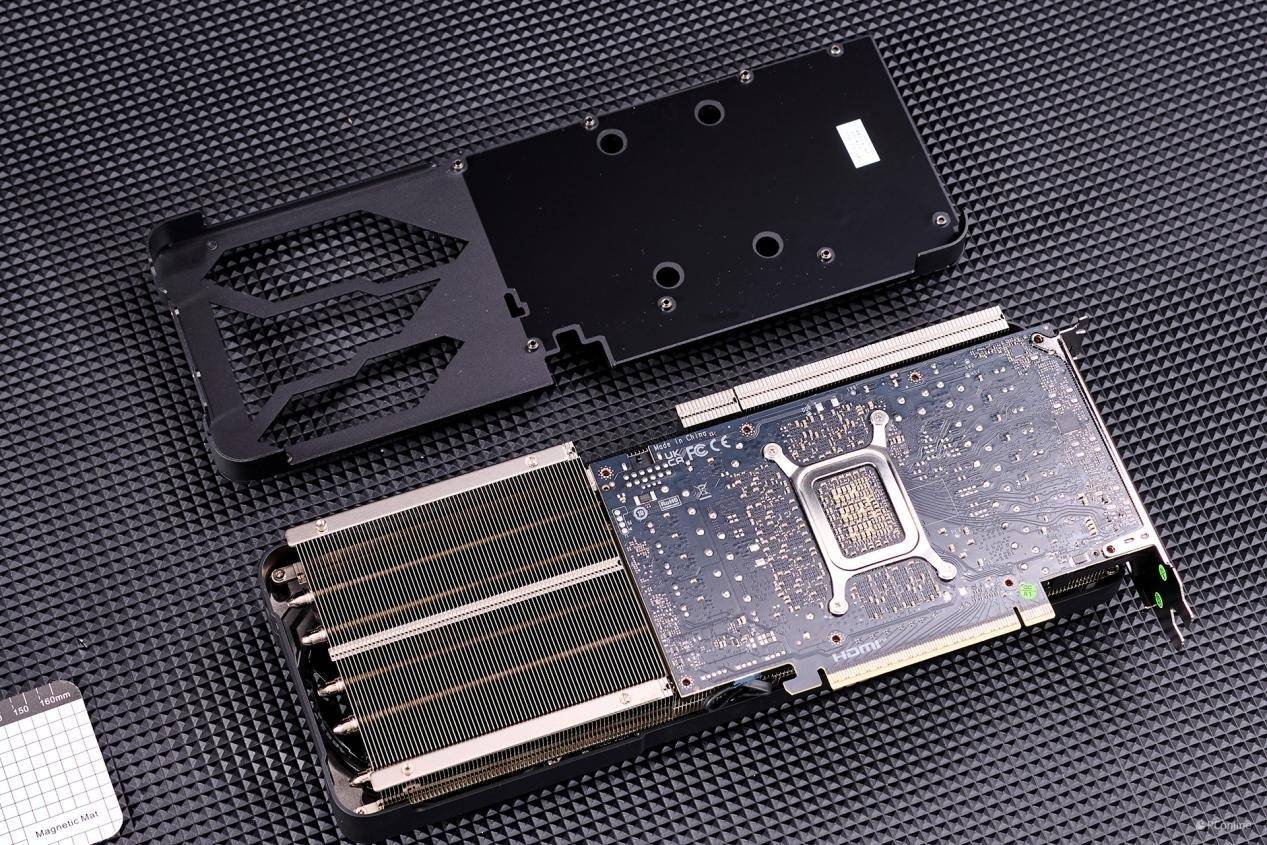 显卡的PCB背面同样布满了众多的MLCC颗粒,主供电控制器也位于这一面,因此配备金属背板显得尤为必要。