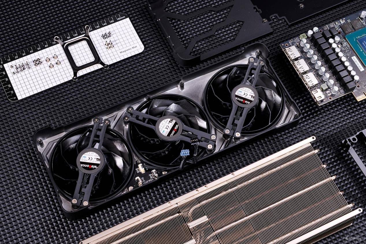内置的风扇分线HUB小板,三把风扇分为两组,可以通过影驰自家的魔盘XtremeTuner软件进行控制。