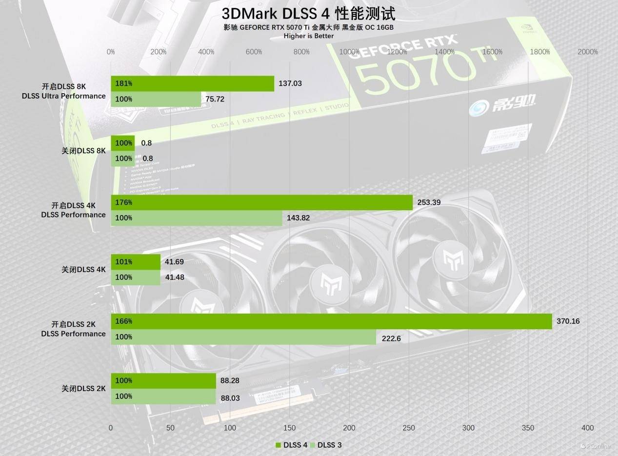 随后是3DMARK DLSS测试中(DLSS3性能测试),影驰RTX 5070 Ti 金属大师OC 16GB的表现同样抢眼。在DLSS 3技术加持下,其延续了刚才的性能提升幅度,部分项目甚至超过了40%,展现出了强大的AI加速能力。这意味着在支持DLSS 3的游戏中,玩家将能够享受到更加流畅、细腻的游戏画面,同时获得更高的帧率表现。