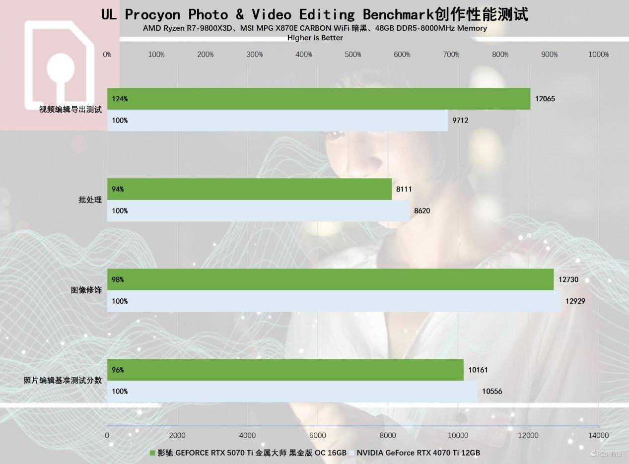 但是其在LR软件上的性能表现是不太理想的,即使是我们把PS与LR软件版本更新到较新的版本,但是其在UL Procyon图片测试中更是比上代RTX 4070 Ti要差些。这一情况就与之前的PCMARK10里的内容创作测试一样,笔者相信是驱动目前仍未足够完善导致的。