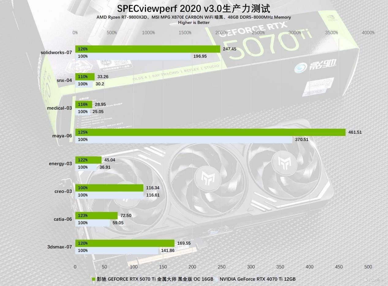 再看看工业领域的表现,SPEC2020能够反映显卡的工业能力,在多项测试中影驰RTX 5070 Ti 金属大师OC 16GB依旧足够的猛,对比RTX 4070 Ti平均有16%的提升。