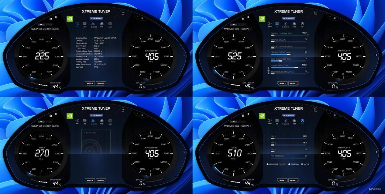 影驰最新版本的魔盘XtremeTuner软件就可以支持GEFORCE RTX 50系列显卡,已经能够正确识别出影驰RTX 5070 Ti 金属大师OC 16GB显卡,同样还能对显卡进行实时侦测、超频、一键超频、RGB彩灯调节(金属大师系列不可用),以及显卡风扇转速调节等。