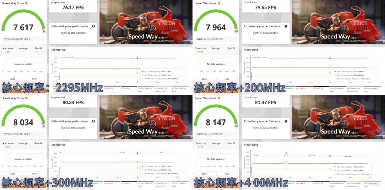 影驰RTX 5070 Ti 金属大师OC 16GB核心频率为2295MHz,运行3DMARK Speed Way时得分为7617,核心频率实际运行在2722MHz。