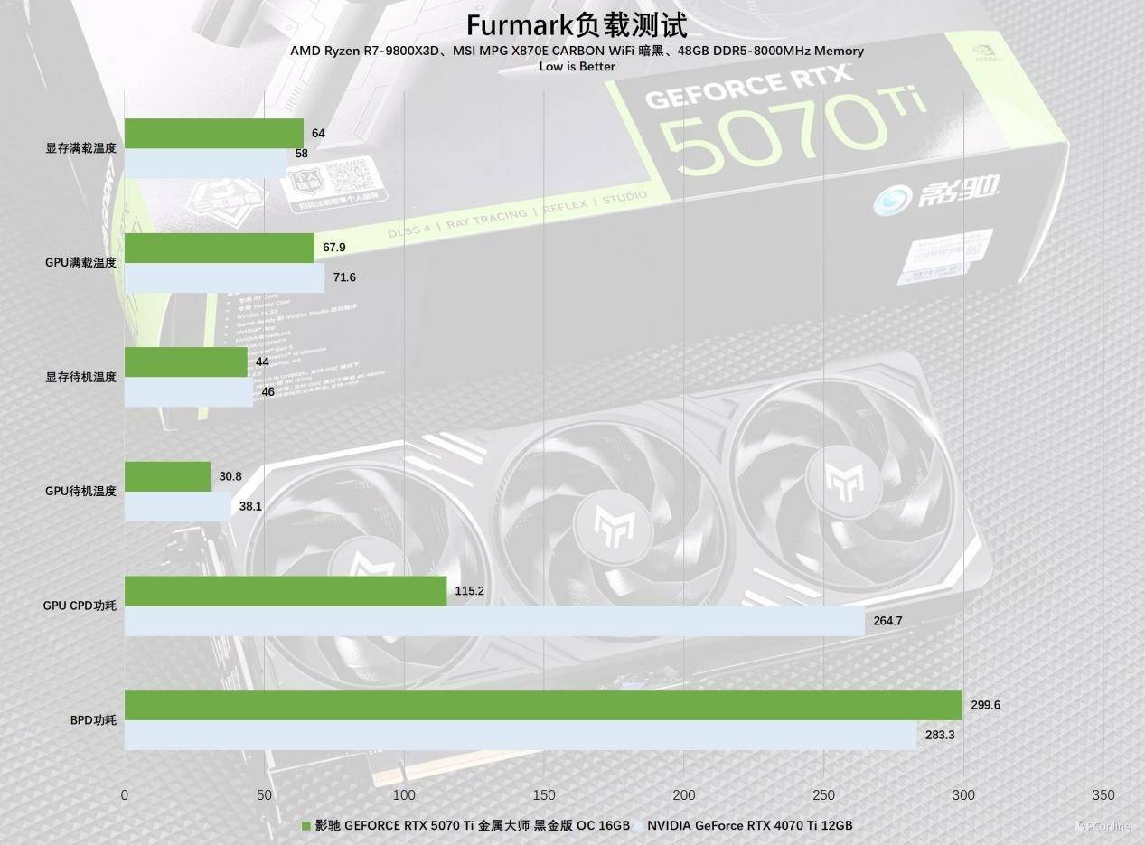 在与RTX 4070 Ti进行对比时,尽管影驰RTX 5070 Ti 金属大师OC 16GB的热设计功耗(TDP)有所提升,但其烤机时的整体功耗仍然维持在较低的水平。此外,这款双槽显卡在减薄的同时,依然能够有效地控制核心与显存的温度,这确实令人感到惊喜。对于ITX平台的玩家而言,这无疑是一个好消息,意味着即便是小型主机也能享受到强大的性能。