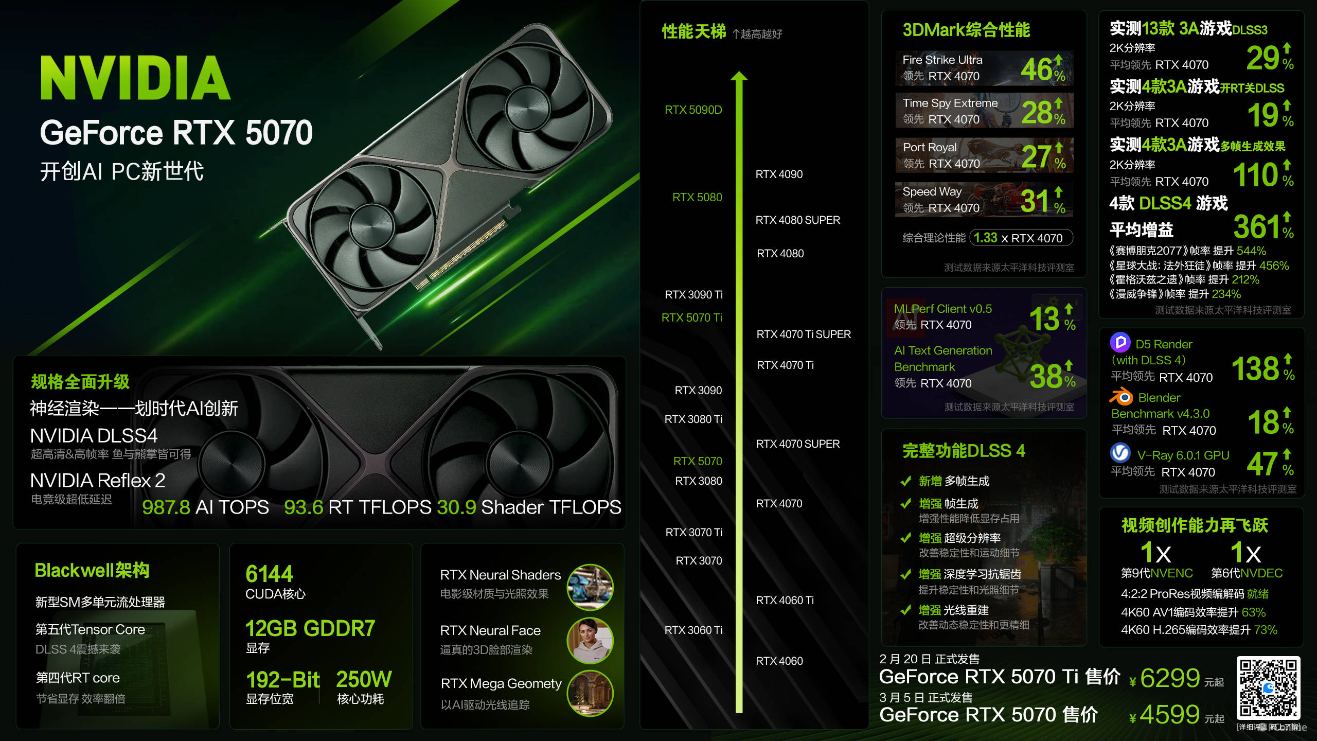 就在前两天,RTX 50系的70级终于来了!全新服务器级别的Blackwell架构,TSMC 4N工艺打造,还有DLSS 4、Reflex 2等诸多黑科技集于一身!现在参数和定价上更为主流的GeForce RTX 5070来了。