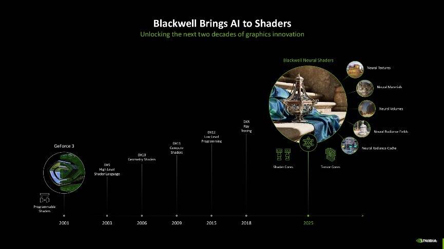 接着我们再细说一下这一代架构最大变化,NVIDIA这次将Blackwell架构的SM单元直接称为神经网络着色器。相比较于之前的可编程着色、CUDA统一着色、通用计算着色来说,其最大的变化就是引入了AI,AI将会彻底改变GPU的着色方式。