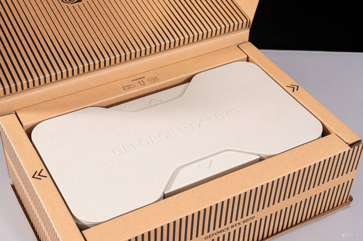 继续拆开包装就能看到显卡被放在一个充满设计感的包装盒中。包装盒表面再度注明了“GEFORCE RTX 5070“字样。