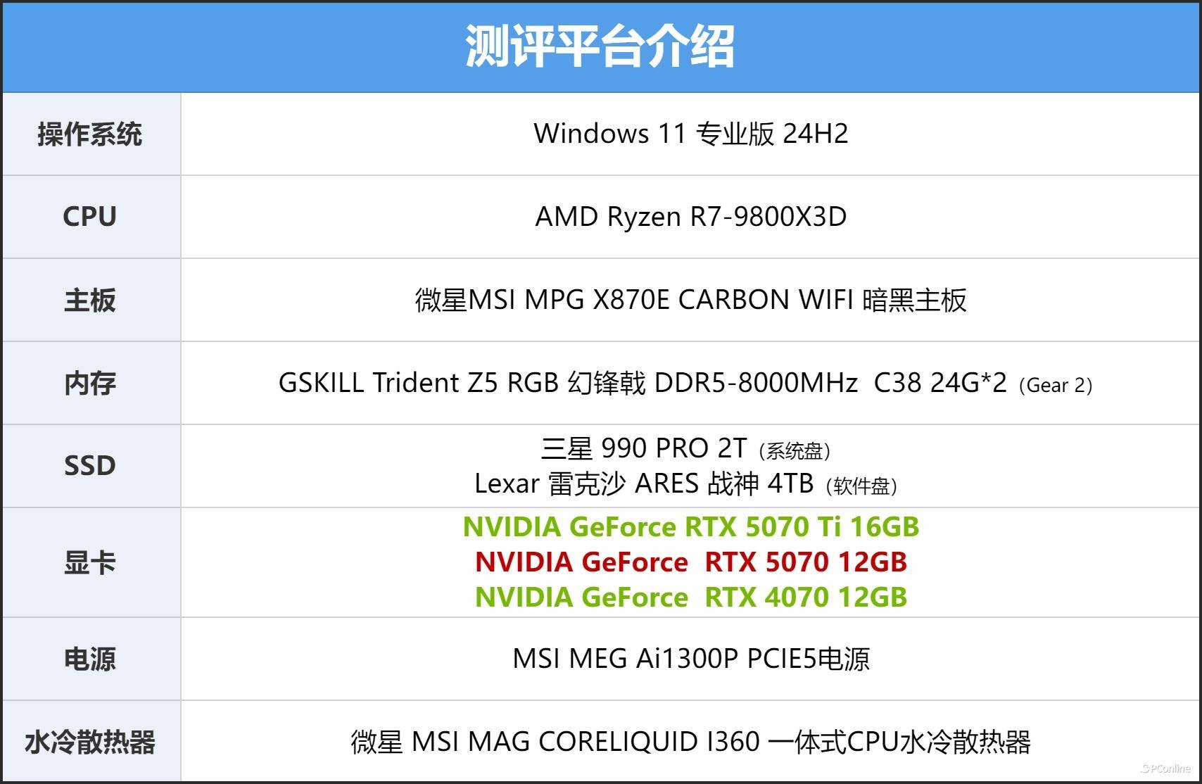 当然理论性能终归是纸上谈兵,还得进游戏里实际测试一下才知道GeForce RTX 5070的实力。这里我们选取了12款游戏进行测试,包含光追及光栅性能方面的测试,而游戏画质方面均全部选择最高画质,光追设定部分,如有则采用最高。