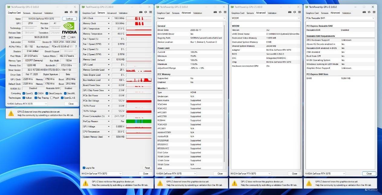 开始测试前,照例还是要“认识”一下这张显卡。由于GPU-Z还没适配最新的显卡,因此部分信息还不能显示,不过从目前的信息中可以看到GeForce RTX 5070的基准频率为2325MHz,Boost频率为2512MHz,并且ROPs也是80组,CUDA数量为6144个,并没有出现缺失。其他方面则是这张显卡的TDP为250W,并且还配备了战未来的PCIe 5.0接口。