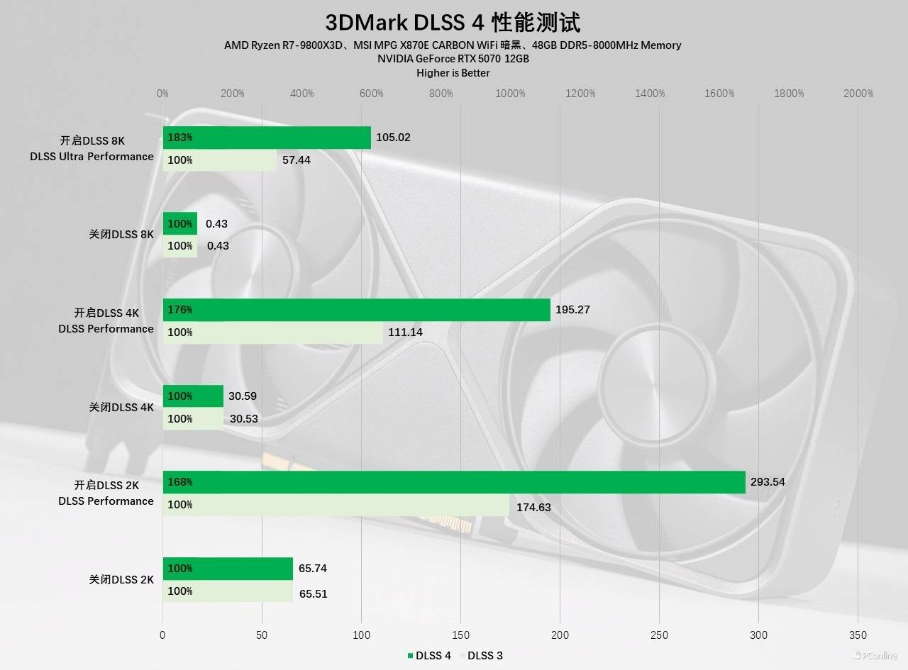 简单介绍完,我们再看看DLSS 4的理论表现如何,还是经典的3DMark测试。不得不说GeForce RTX 5070搭配上DLSS 4后,帧数就跟打了鸡血一样,开关前后的性能简直天壤之别!其中2K分辨率下,开关前后性能差距接近5倍之多。4K分辨率下就更离谱了,开关帧数差距得有6倍,即便是对比DLSS 3的话,帧数也能提升70%以上,这已经快做到翻倍了,看来游戏要变天了。最离谱的还要属8K,要知道RTX 40时代,8K游戏在大多数玩家看来还不太实际,8K更像是高端旗舰的专属,但是现在GeForce RTX 5070在DLSS 4加持下可以做到105 FPS,只能说未来可期,说不定不久的将来,主流显卡也能有8K体验。