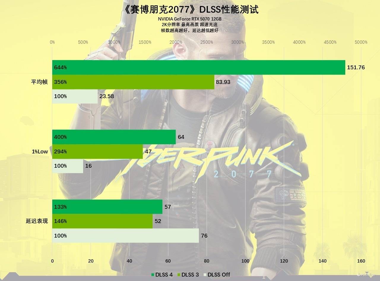 实测这款游戏对显卡的压力还是不小的,不开任何超分技术,几乎不可玩。在2K原生分辨率下,GeForce RTX 5070的平均帧仅有可怜的27 FPS,不单止卡成PPT,延迟也是高得吓人。此时开启DLSS 4质量档以后,游戏平均帧直接暴增至150 FPS,妥妥的2K高刷3A体验,对比原生2K的表现,足足有5.5倍左右的提升。即便是对比DLSS 3的82 FPS,那也是接近翻倍的性能提升,还是挺不错的。同时延迟表现也几乎下降了一半,非常可观。