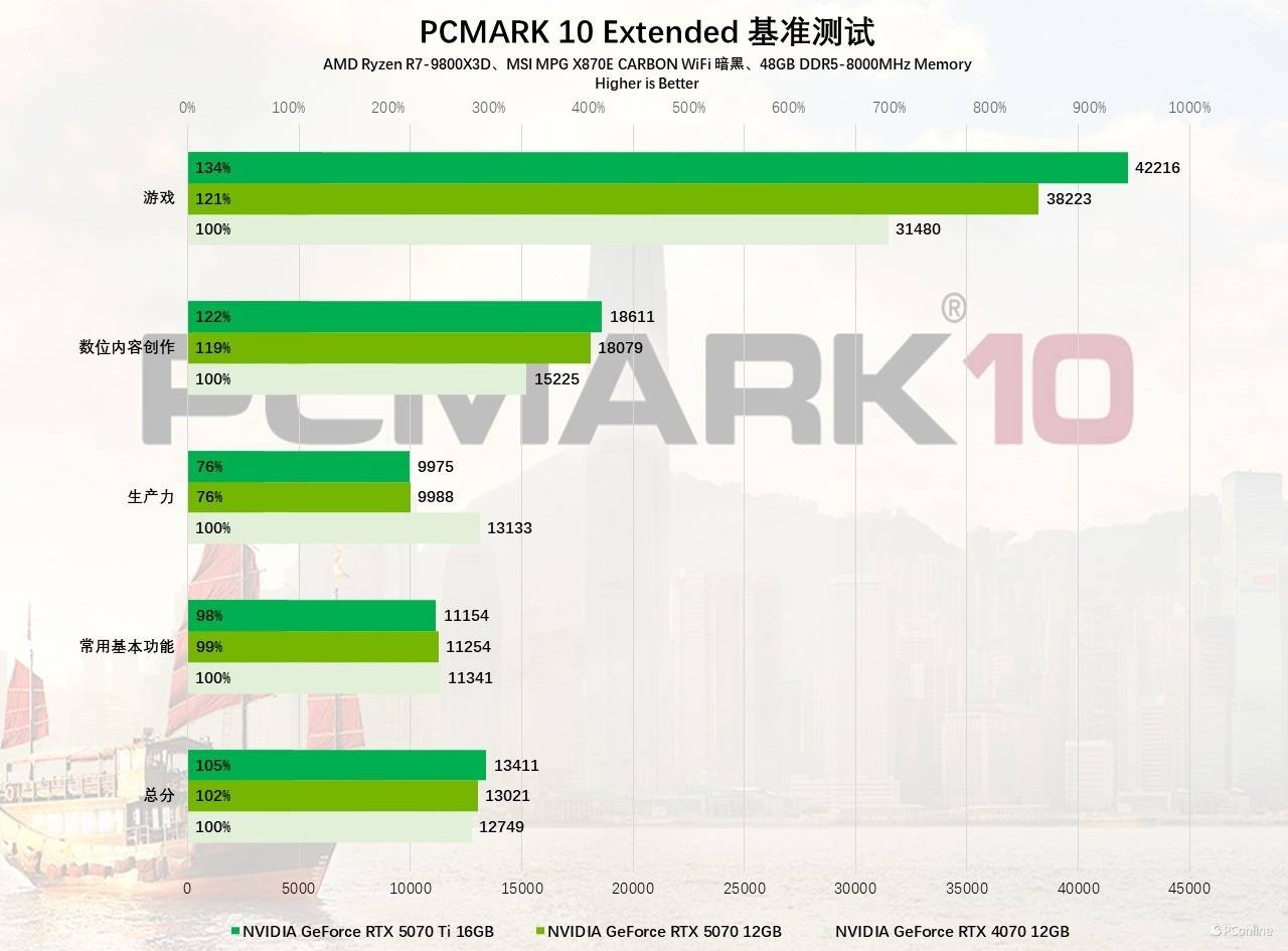 游戏测完,下面就来看一下创作者们比较关心的生产力性能,在PCMark10 Extended测试, GeForce RTX 5070在游戏、数位内容创作方面的表现更佳,基本上要比RTX 4070高20%,即便与RTX 5070 Ti的差距也不大,二者相差10%左右,整体可圈可点。不过生产力方面的成绩则比较低,与我们之前测试的其他RTX 50系显卡类似,推测是目前驱动还不完善所致。