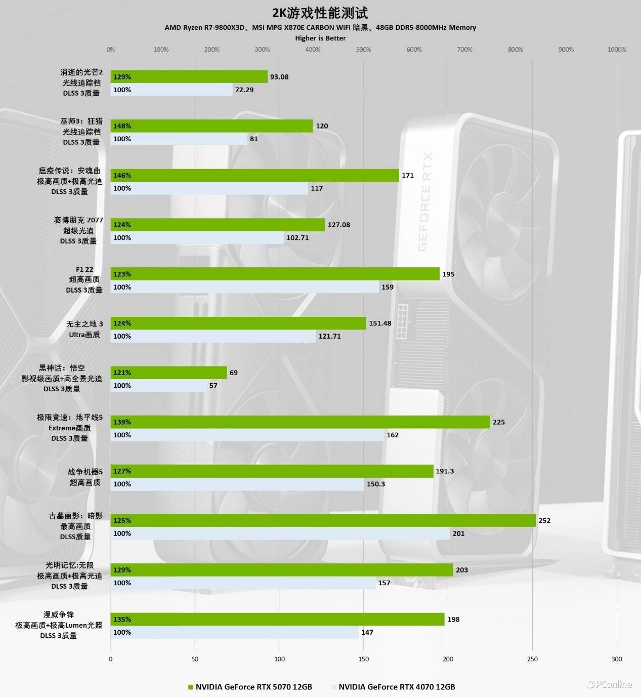 实测2K分辨率下,GeForce RTX 5070应对绝大多数游戏都轻轻松松,甚至不少3A大作跑到了200+FPS,远超高刷的需求。即便是压力比较大的,像全高设置的《黑神话:悟空》,这款显卡也能有69 FPS的表现,畅玩绝对没有问题,后续如果有DLSS 4想必帧数提升会更加迅猛。具体到性能上,在这么多款游戏里,GeForce RTX 5070整体比RTX 4070强约25%左右,部分优化出色的游戏中,这个差距甚至可以拉大至50%左右,例如《巫师3:狂猎》。