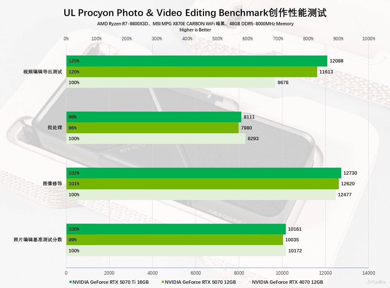 上点强度,看看UL Procyon的图像编辑以及视频剪辑的测试,实测三款显卡在图像编辑上几乎不分伯仲,而在视频剪辑方面,情况就有些不一样了。果然最新的RTX 50系显卡优势还是非常明显的,GeForce RTX 5070对比RTX 4070,提升了足足20%,与老大哥RTX 5070 Ti的差距也缩小至5%左右。