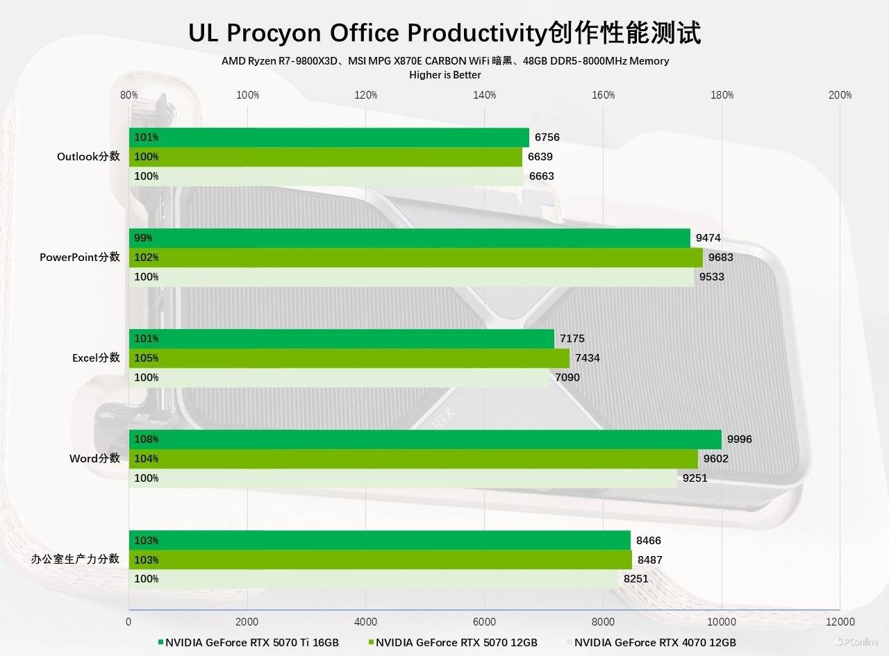 再关注一下不同场景的性能表现,首先是UL Procyon办公软件测试,GeForce RTX 5070表现也不错,整体性能可以领先3%左右,其主要领先在Excel、PPT以及Word三项,不过有一说一,这三张卡用来办公只能说确实有些浪费了,用它们打开这些软件,差距应该都是微乎其微的。
