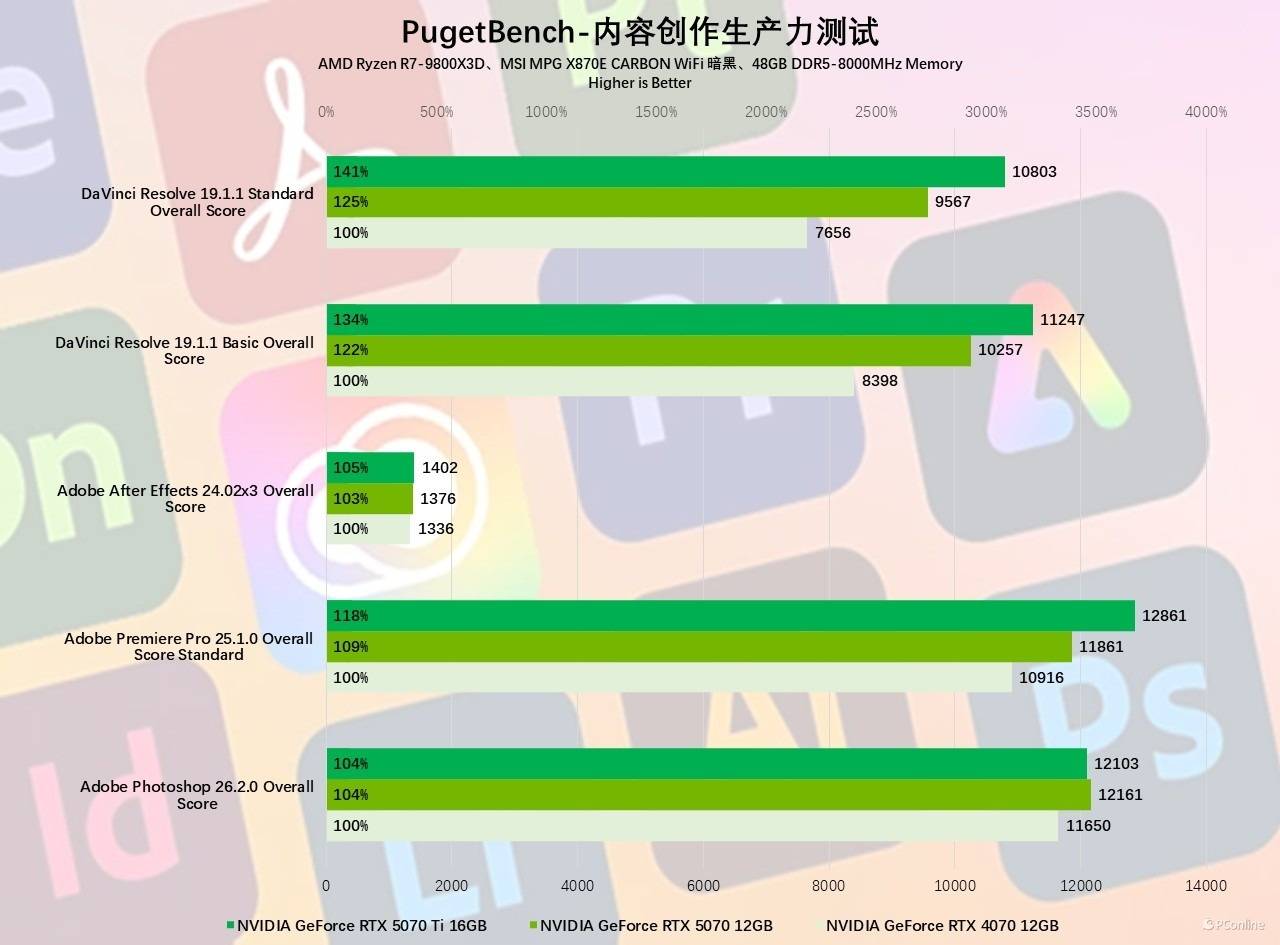 在Adobe以及达芬奇的Benchmark测试里,GeForce RTX 5070的表现也差不多,整体相比RTX 4070有小幅提升,不过提升比较大的还是视频编辑部分,究其原因还是因为这一代RTX 5070再度对编码器进行了升级,不仅编解码的效率更高,同时支持的格式也更丰富。例如在达芬奇和PR的测试中,GeForce RTX 5070领先RTX 4070约9-25%,还是非常夸张的。同时在PS以及AE里也有小幅的性能提升,总体来说就是内容创作的效率更高了。