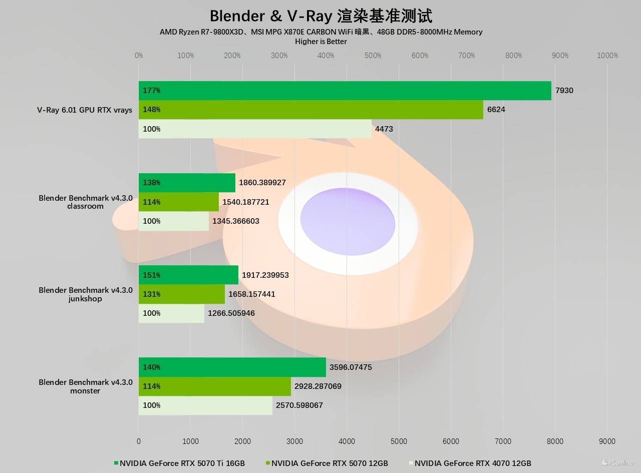 看完了图像视频方面的创作,我们再把目光投向3D渲染以及工业领域的软件中,看看RTX 50系显卡又有怎样的精彩表现。还是熟悉的朋友Blender以及V-Ray,在这两款软件中,GeForce RTX 5070的表现也是技惊四座,其中前者基本上能领先RTX 4070达14%-31%,而后者就夸张了,对比RTX 4070,甚至可以领先至48%。不过与RTX 5070 Ti比起来,还是有30%的差距,果然RTX 50系最具性价比卡确实不一般。
