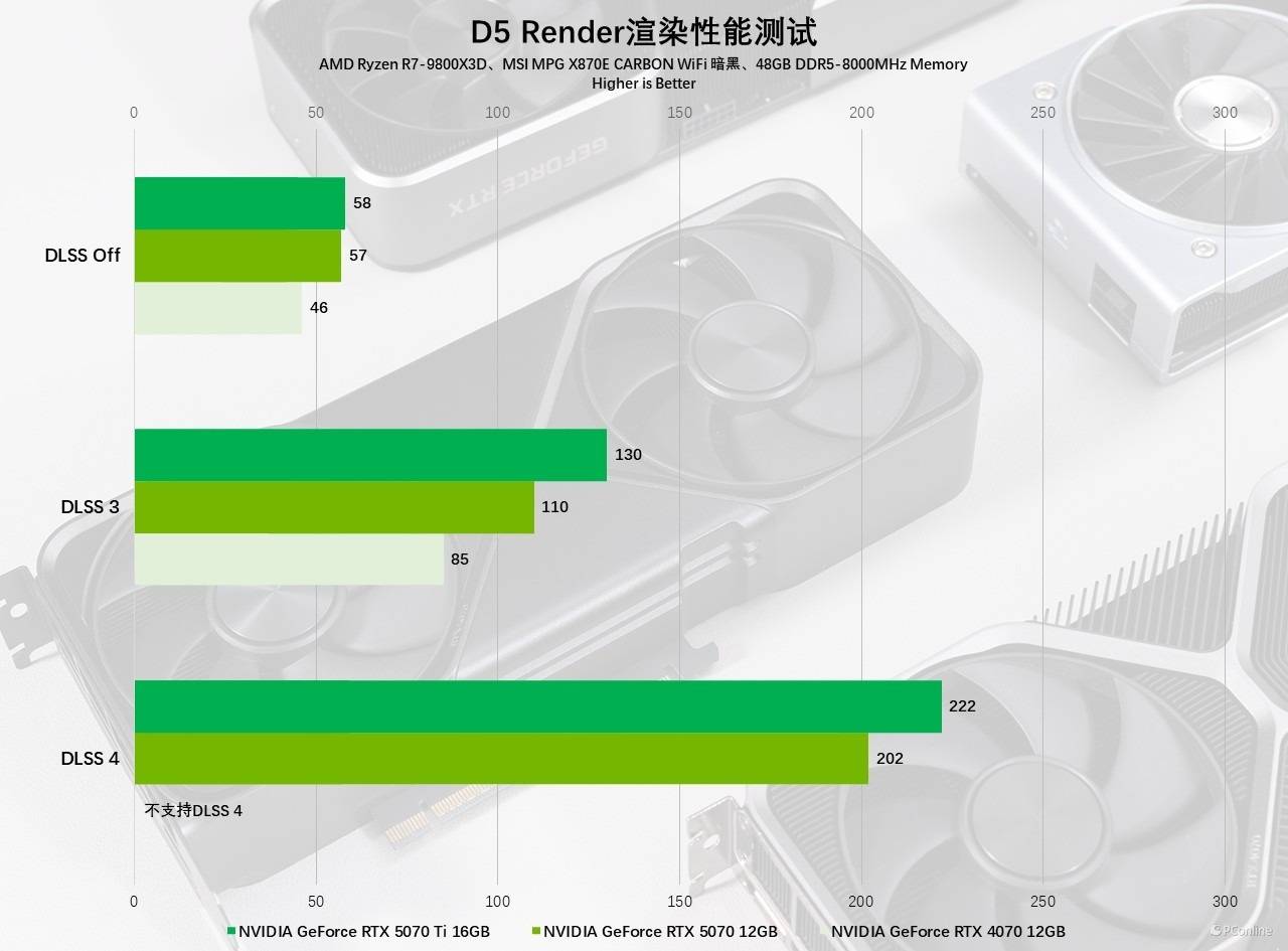 再看看另外一款渲染器,D5 Render是一款基于DXR和光线追踪技术构建的GPU渲染器。正因为其有光线追踪技术,其渲染的画面相当出色。这款软件在RTX 40系显卡测试时支持了DLSS 3帧生成,而现在随着RTX 50系显卡的发布,它也可以通过NVIDIA app的方式支持最新的DLSS 4多帧生成功能。