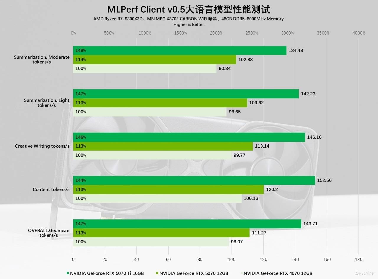 在AI文本生成测试中,GeForce RTX 5070也带给我们不小的惊喜,我们用MLPerf Client v0.5大语言模型进行测试,它是基于meta的Llama 2 7B开源LLM打造,涵盖了四项AI任务,分别是内容生成、创意写作以及对两份不同长度文本进行总结摘要。实测GeForce RTX 5070在每一项中都表现出了绝对的统治力,各项领先幅度均在13-14%左右。
