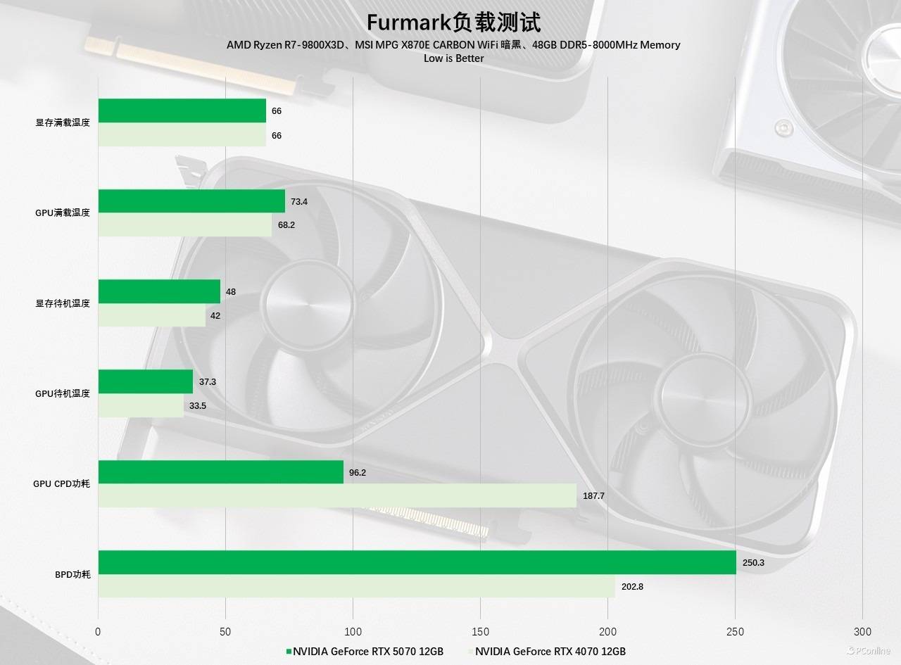 横向对比RTX 4070时可以看到,GeForce RTX 5070的TDP小幅上涨了,不过整体的烤机功耗并不算高,核心与显存的温度控制确实不错,满载时GPU核心比上代高了不到5℃,但是性能提升足足有30%之巨,属于是非常惊喜了。