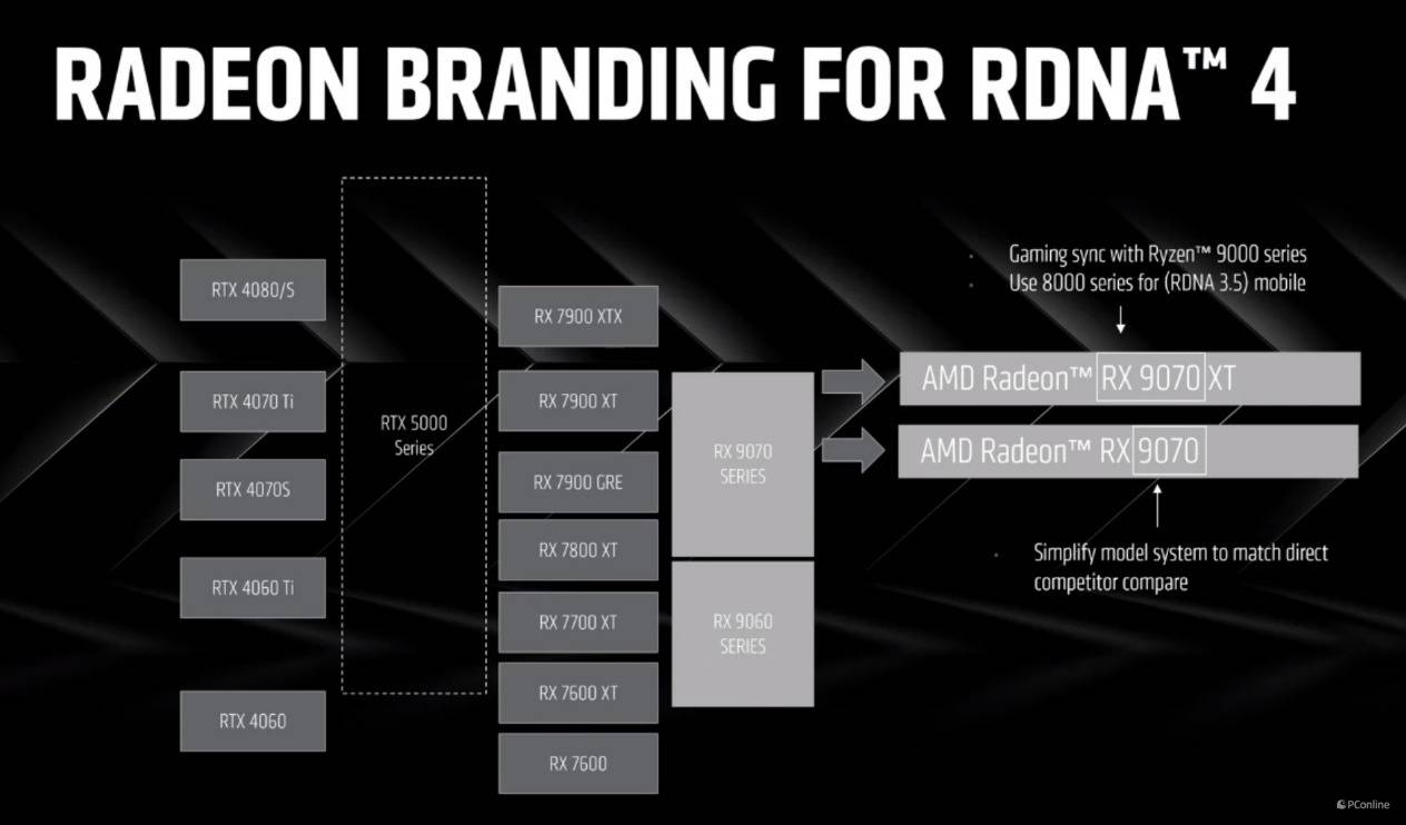 在介绍RDNA 4架构的各项黑科技之前,我们先来聊聊本次RX 9000系显卡的命名规则,众所周知,AMD的上代显卡为RX 7000系列,按照常理来说,本次发布的两张新显卡应该属于RX 8000系列才对。而AMD之所以采用RX 9000进行命名,是为了和自家处理器命名体系保持统一、方便玩家识别和搭配。