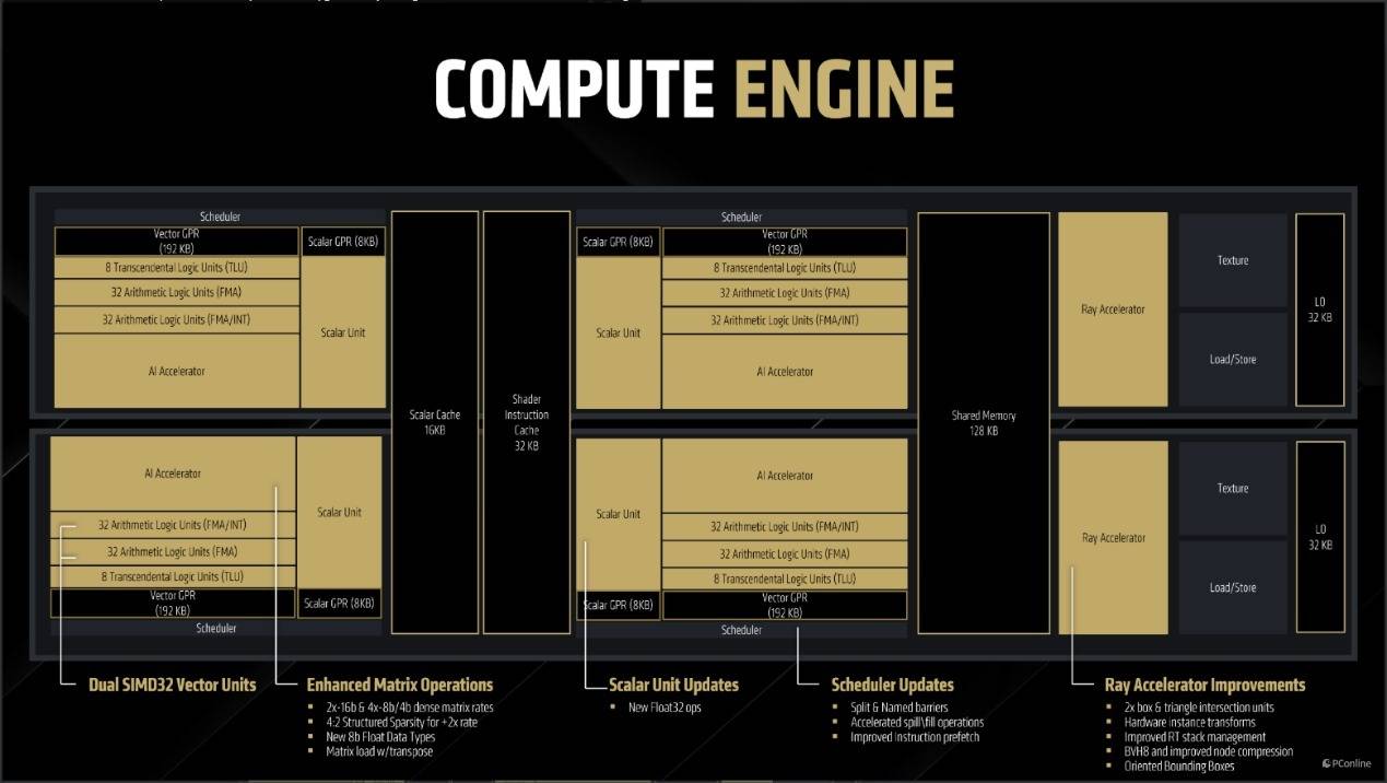 每个CU单元包括两个双SIMD矢量(向量)单元、一个标量单元、两个AI单元、两个调度器,两组共享缓存。另外还有两组光追加速器、两组纹理单元、两组载入/存储单元、两组L0缓存,以及共享显存。