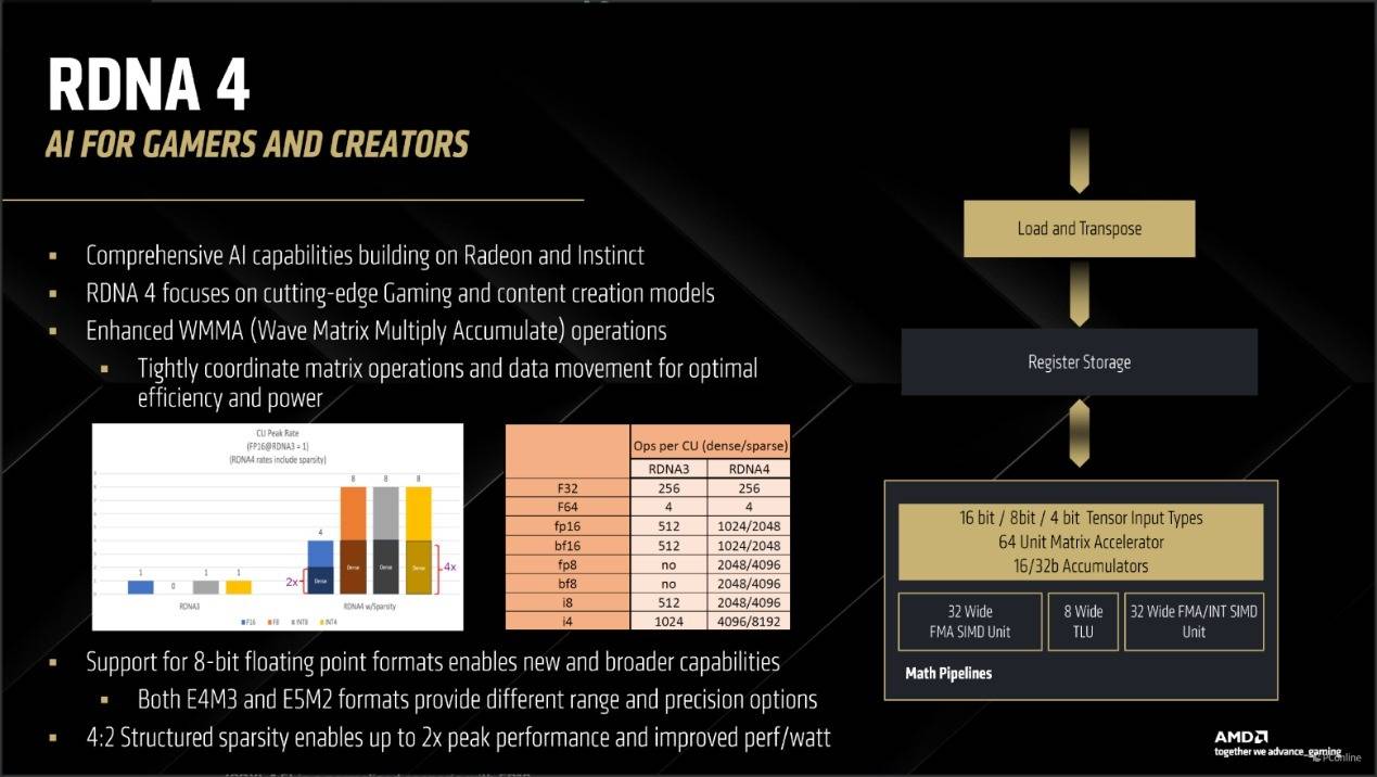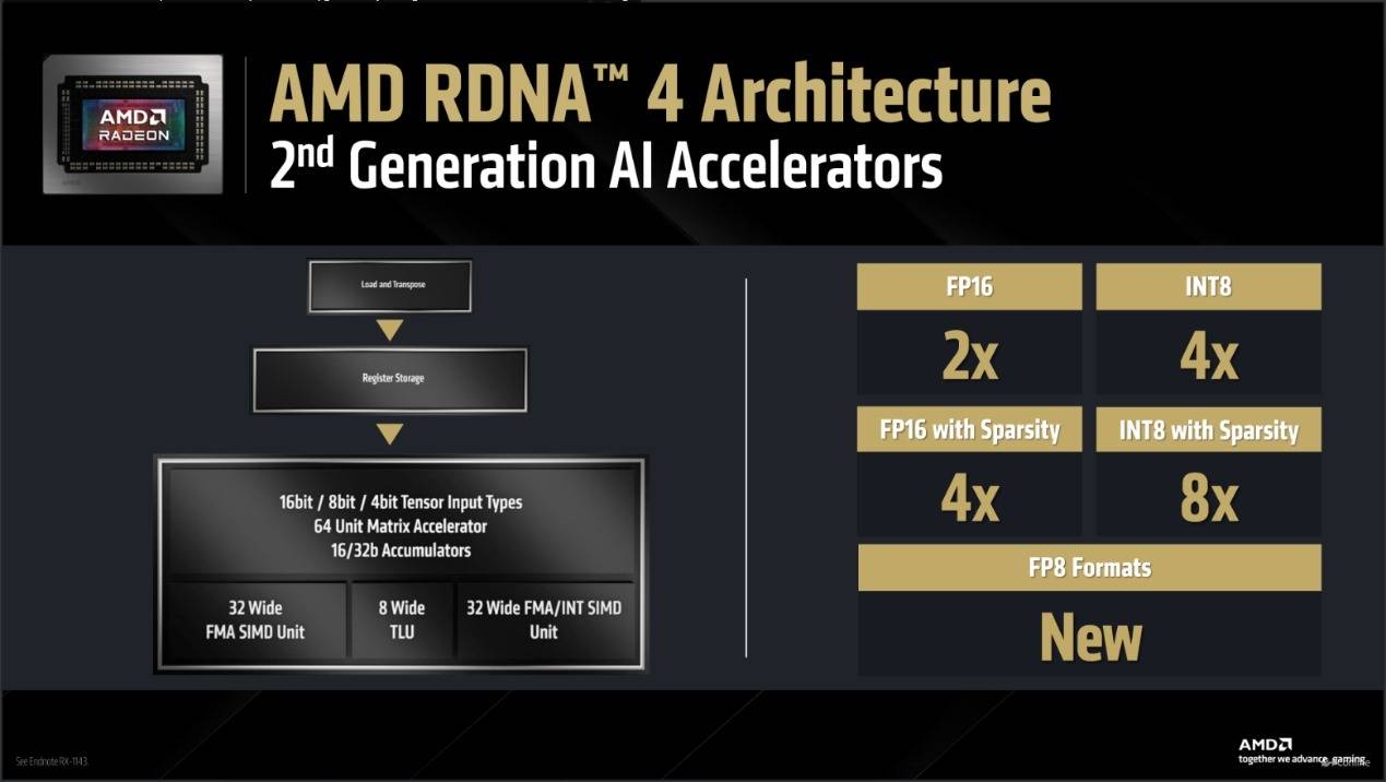 除了计算单元的优化外,RDNA 4架构也升级了第二代加速器,支持结构化稀疏性等推理优化技术,支持16/8/4bit Tensor输入,新增FP8数据格式,但不像RTX 50系列那样支持FP4。在规格上,每一个AI加速器内,都包含64单元矩阵加速器、16/32bit累加器、32宽度FMA(融合乘积累加) SIMD单元、32宽度FMA/INT(整数) SIMD单元、8宽度TLU(阈值逻辑)单元。