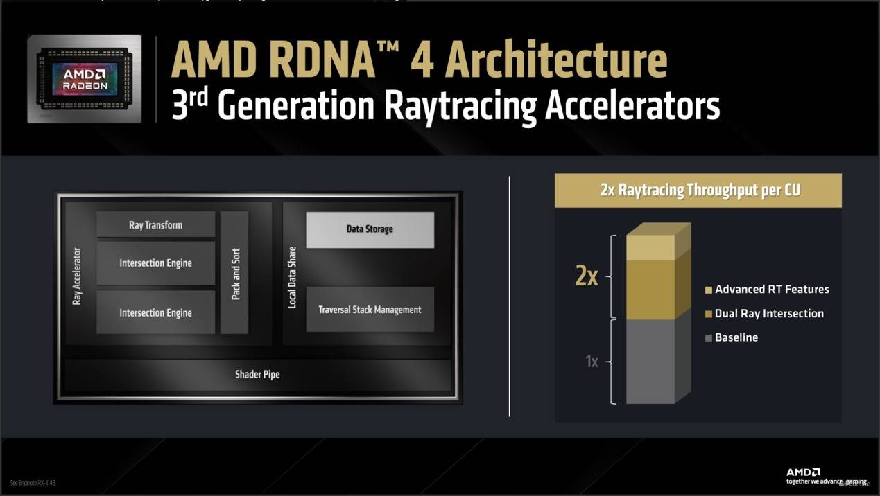 在光线追踪方面,RDNA 4架构也取得了显著的进步。这次更新换代成第三代,每个光追单元内包括一个光线加速器、一个光线转换引擎、两个光线交叉引擎、一个遍历堆栈管理单元等。相比 RDNA 3,RDNA 4架构的光线追踪性能提升了两倍。这得益于RDNA 4 架构引入了新的光线交叉引擎和光线变换引擎,以及新的定向包围盒技术。这些改进使得光线追踪的计算速度更快,能够更高效地处理复杂的光线追踪任务。光线交叉引擎的性能提升,也让光线追踪的精度和速度都有了显著的提高,能为用户提供了更加逼真的视觉体验。
