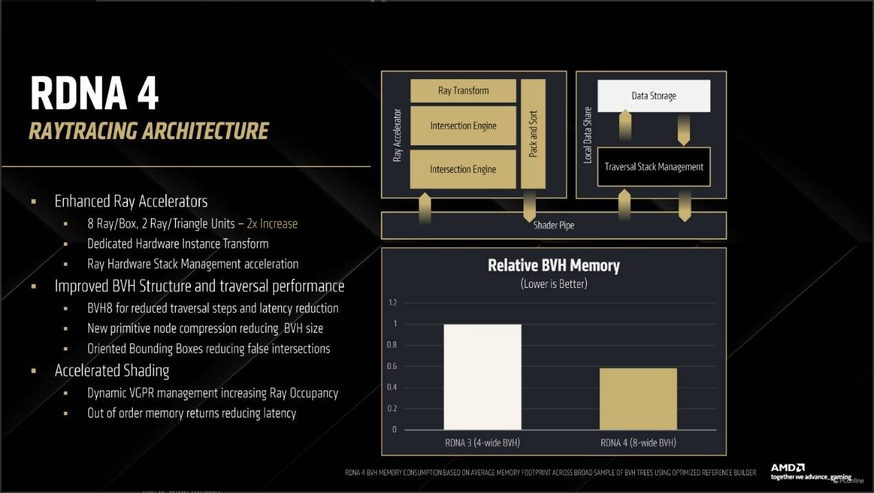 此外,RDNA 4 还改进了 BVH(Bounding Volume Hierarchy)压缩和加速的光线遍历与着色,显著降低了 BVH 的内存需求,RDNA 4架构在开启光追后的内存需求也相比RDNA 3下降了40%。