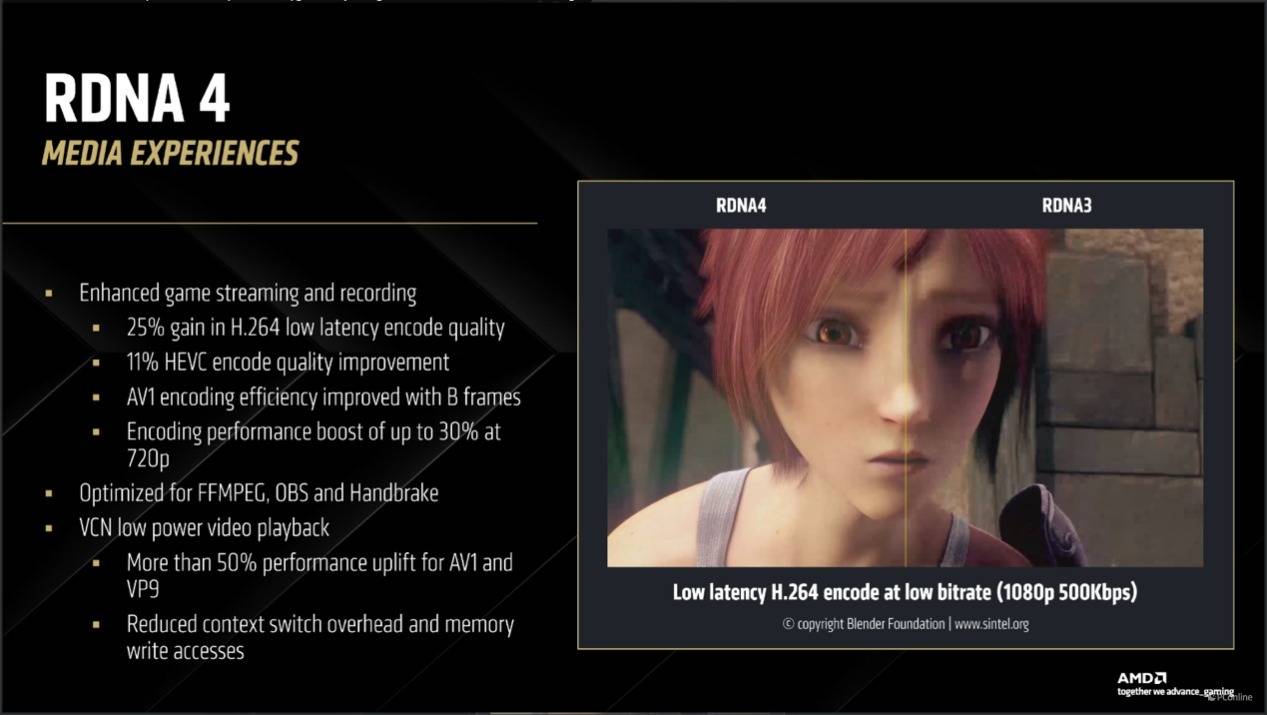 针对多媒体引擎,RDNA 4架构也进一步增强,新架构的媒体引擎主要优化提高了录制和传输时编解码器(如 H.264、HEVC 和 AV1)的编码质量。例如,在使用 H.264 编码器以 500 Kbps 进行游戏流式传输时,RDNA 4的媒体引擎可以显著提升图像质量。