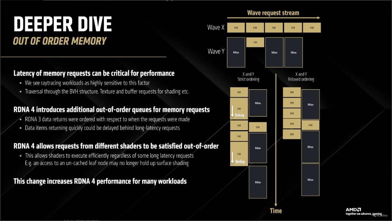 同时RDNA 4 架构还支持宽松的无序内存请求,这项改进不仅提高了光线追踪性能,还改善了其他工作负载的效率。相比之下,RDNA 3架构则在内存请求的顺序性上较为严格。