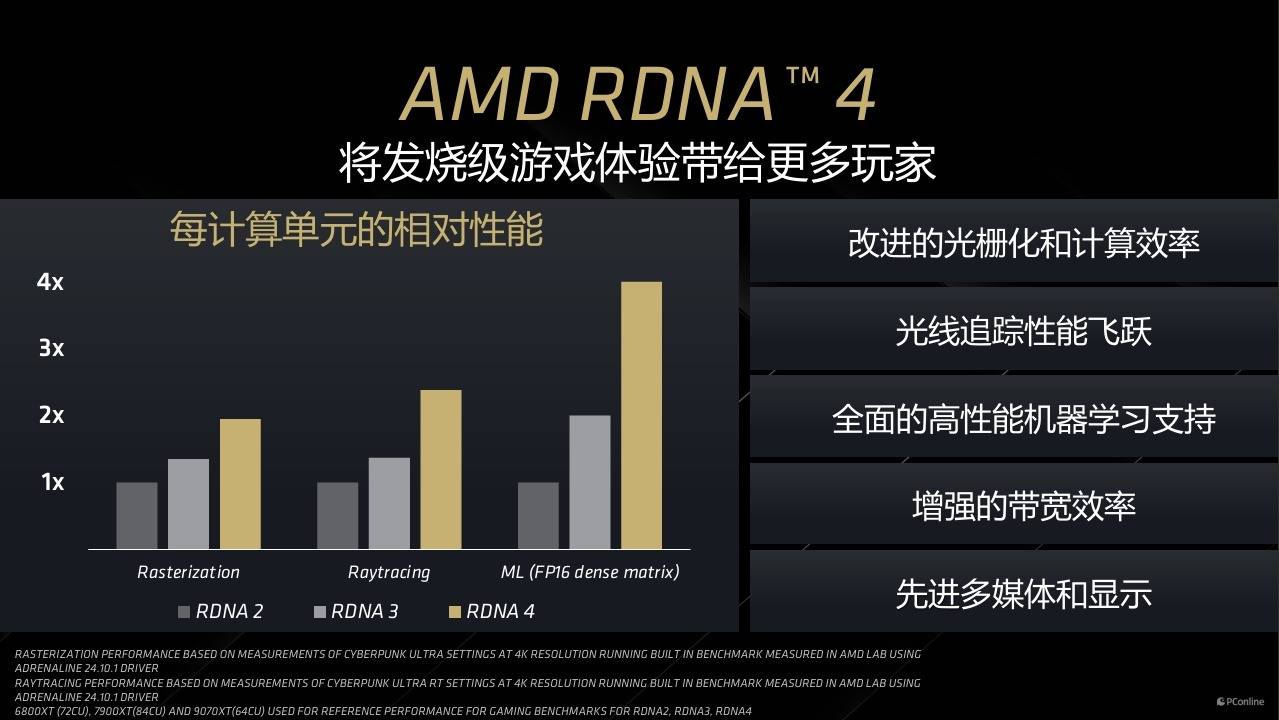 总的来说,RDNA 4全方位地提升了玩家的游戏体验,真正将发烧级游戏体验带给更多玩家。相较于前代架构,RDNA 4在每计算单元的相对性能上有了显著提升。在光栅化方面,性能提升至原来的4倍,这意味着游戏的帧率和流畅度将得到极大优化,玩家能够享受到更加顺滑的游戏画面。而在光线追踪性能上,也有着飞跃性的进步,提升至 3 倍左右,这将使游戏中的光影效果更加逼真,为玩家呈现出更加沉浸式的游戏世界。此外,机器学习(ML)性能的提升,为游戏中的 AI 元素和智能交互提供了更强大的支持,进一步增强了游戏的趣味性和真实感。